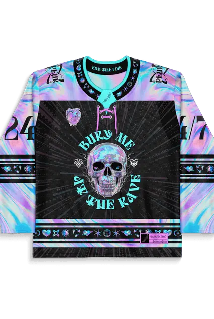This isn’t your average jersey—it’s a resurrection-ready rave relic. The Rave To The Grave Hockey Jersey is a limited edition drop that fuses metallic oil-slick vibes with a “live fast, rave forever” mentality. Featuring an iridescent pastel palette, skull graphics, and name plates “Bury Me at the Rave” and “24/7 To the Grave,” this piece is for the ride-or-dies who never miss a set.