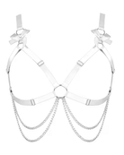 Get your heart racing with our Heartthrob Harness in White! This bra-shaped elastic harness features delicate bows and light chain detailing, for a perfect sweet touch to any rave fit!