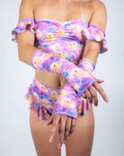 Complete your rave transformation with the Duckies Gloves – fingerless arm warmers that bring style, comfort, and festival energy to every beat. Featuring a bold purple, yellow, and pink color print on breathable mesh, these gloves are the ultimate rave accessory for day-to-night dancing.
