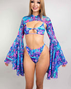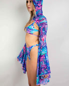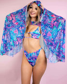 Step into a magical rave world with the Fairycore Mesh Hooded Bell Sleeves, where vibrant blue, pink, and purple fairyland prints bring playful, eye-catching energy to your festival look. Featuring a hood and dramatic bell sleeves, this soft and stretchy mesh design moves effortlessly with you, keeping you cool and enchanting all night long. Perfect for layering over your favorite rave top or pasties, these sleeves turn every dance into a spellbinding moment.