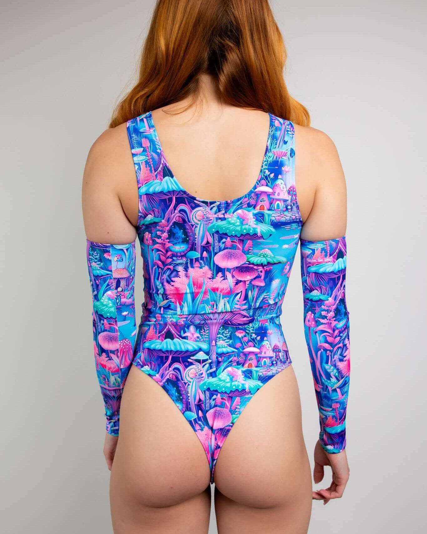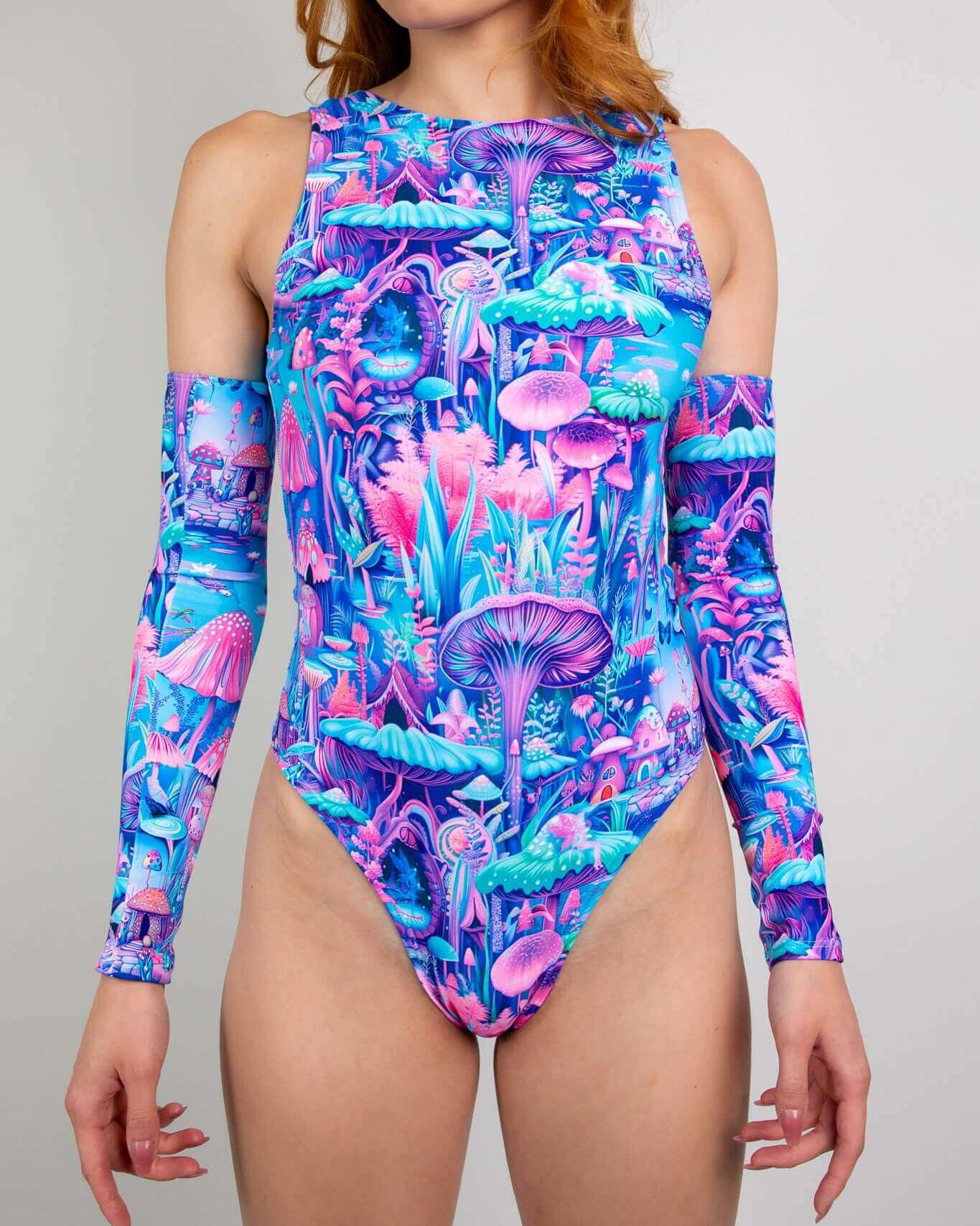 Enter the magical realm of rave fashion with our Fairycore High Neck Bodysuit! We took the sideboob out of our sideboob bodysuit to give you the High Neck Bodysuit. With the same high hip and thong back, this pieces features a full coverage top with a high neckline.