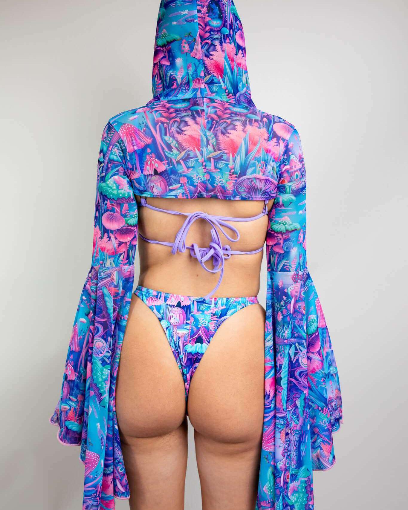 Step into a magical rave world with the Fairycore Mesh Hooded Bell Sleeves, where vibrant blue, pink, and purple fairyland prints bring playful, eye-catching energy to your festival look. Featuring a hood and dramatic bell sleeves, this soft and stretchy mesh design moves effortlessly with you, keeping you cool and enchanting all night long. Perfect for layering over your favorite rave top or pasties, these sleeves turn every dance into a spellbinding moment.