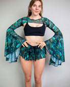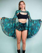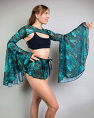 Step into enchanted elegance with our Faewood Mesh Bell Sleeves, the ultimate rave accessory in a stunning teal and green palette. Designed to capture the magic of the forest, these ultra-cropped pullover sleeves bring an ethereal, fairy-like vibe to your rave look. The fitted shoulder and upper arm flow seamlessly into a dramatic bell flare at the elbow, moving with you as you dance through the night. Finished with a secure finger loop, these lightweight sleeves pair flawlessly with your favorite tops or bodysuits for a truly spellbinding ensemble.