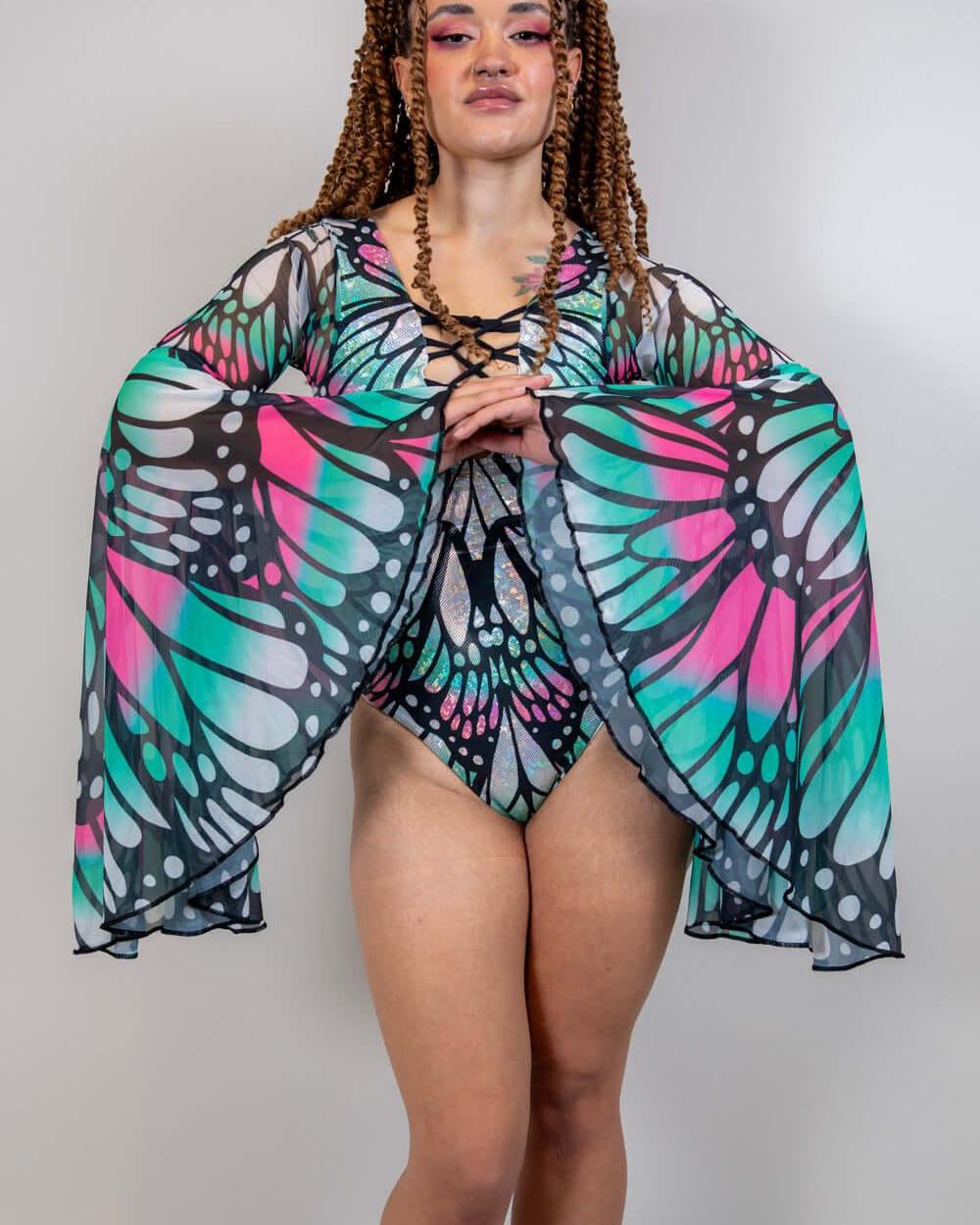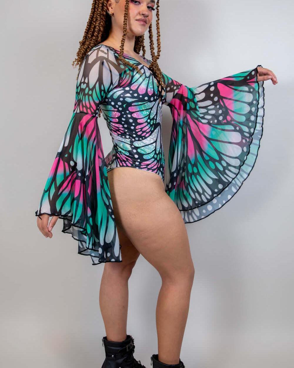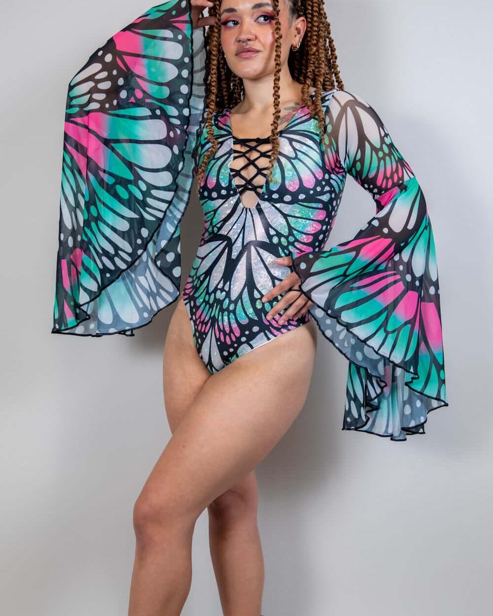 Transform into a Flutter Goddess with our fan favorite bodysuit! Featuring a double lined bodysuit and cheeky back, this piece also boasts lace up detailing at the chest, flowy bell sleeves, and a butterfly inspired pattern. You'll feel absolutely stunning in this magical and enchanting bodysuit.