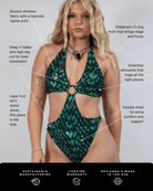 Own the jungle, the dance floor, or wherever your night takes you—this killer-cut bodysuit is your ultimate power piece. The Predator O-Ring Bodysuit brings fierce energy with deep-cut curves, reptilian shine, and a slinky fit that dares to bare while still giving you support.