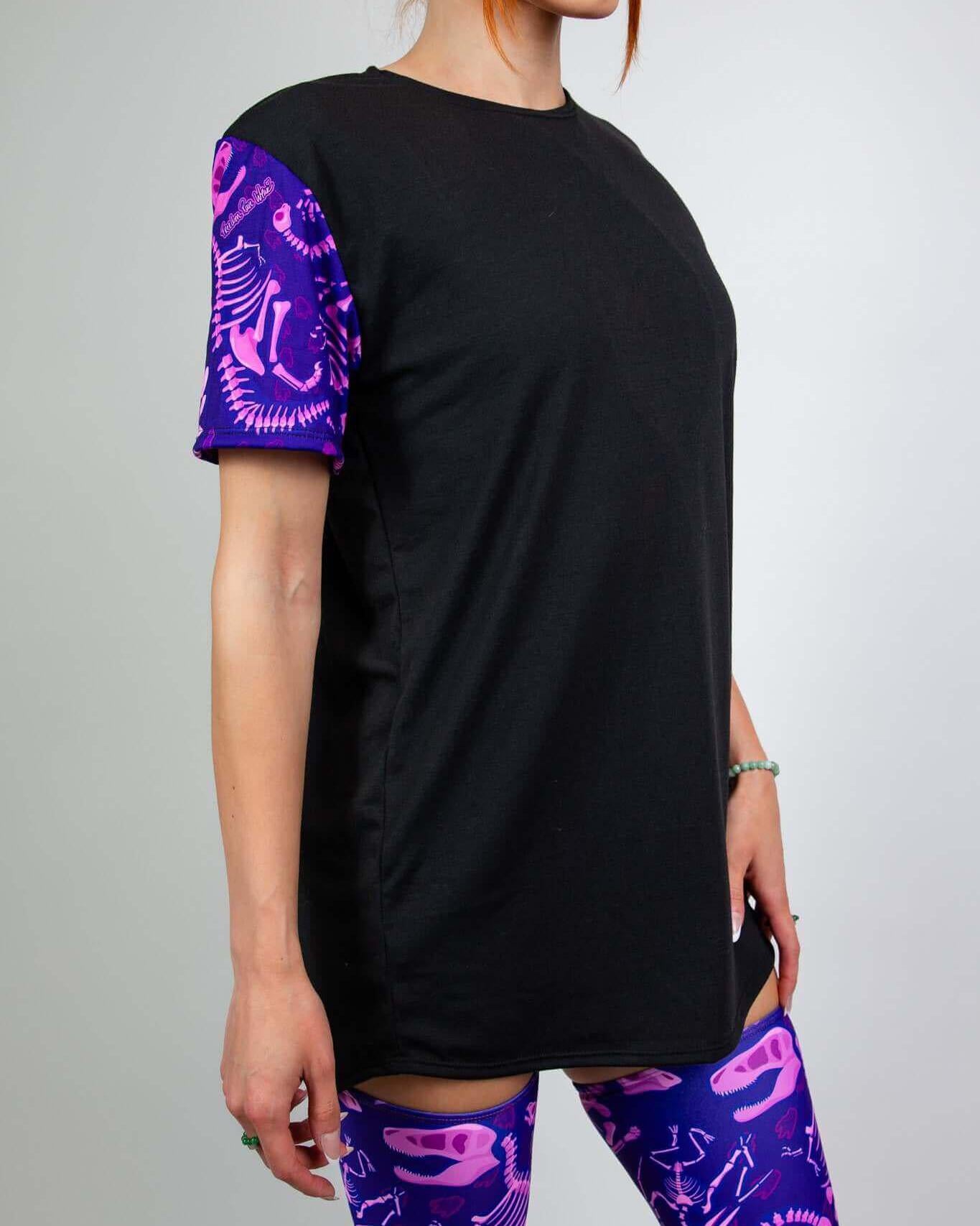 This rave t-shirt is the perfect way to rock your dino-loving style. Its black design with purple dinosaur fossil sleeves is seriously cool. With Baby Steps, you'll be taking the fashion world by storm in no time!