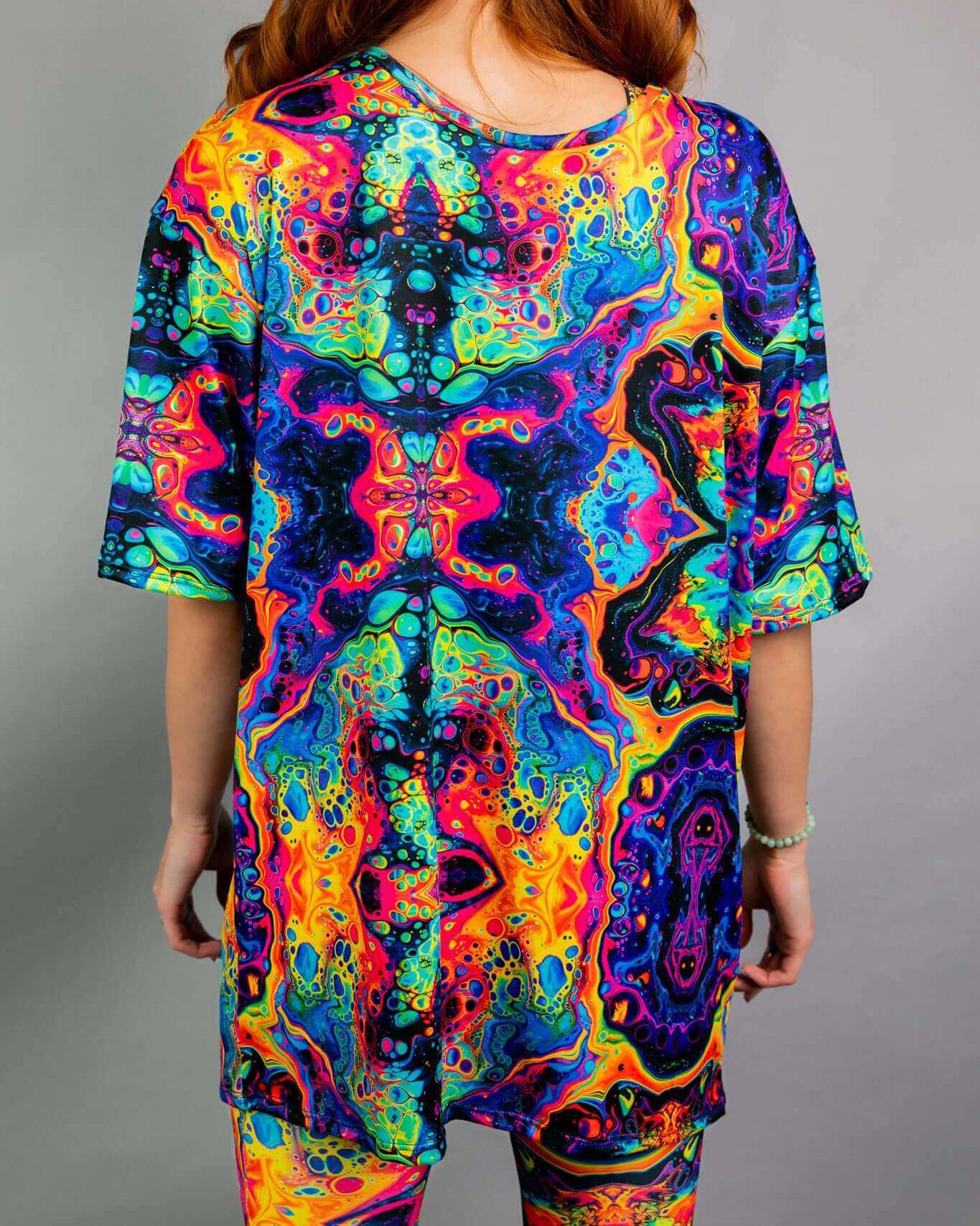 Discover the ultimate comfort and style with our Vivid Oversized Softee. Made from vibrant, trippy rainbow fabric, this oversized rave tee will make you stand out at any event. With its unique design and soft material, it's the perfect addition to your wardrobe for ultimate comfort and style.