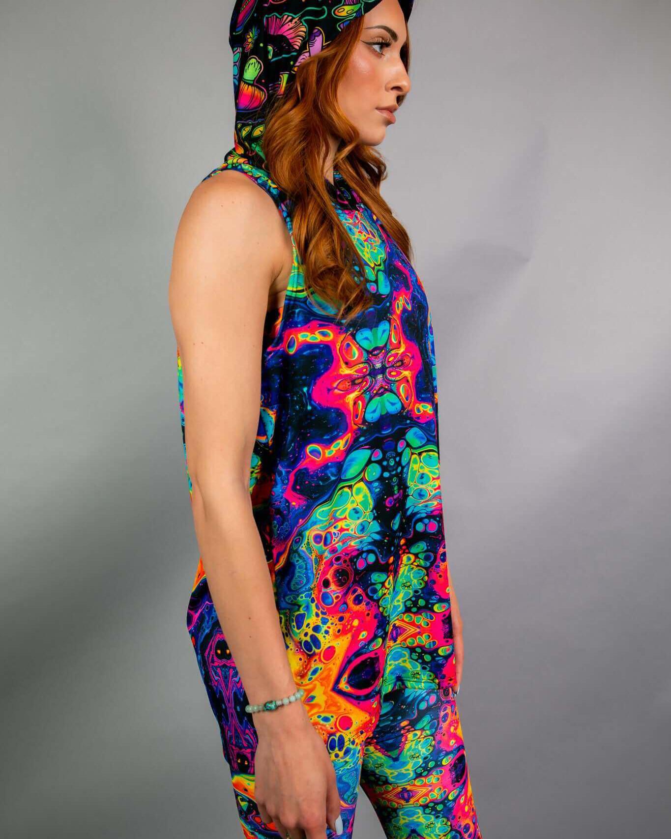 Stay colorful and cool at raves with our Vivid Shroomie! Unisex Hooded Tank Top.