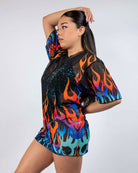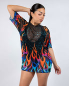 Unleash the flame, feel the freedom. The Blaze V Free Top is a fearless fusion of edgy design and cosmic heat. With a bold flame print, wide tank-style straps, and a sheer mesh V-panel, this crop brings the drama while giving you the freedom to dance, flex, and shine all night long.
