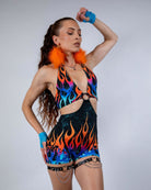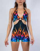 Romper, but make it an inferno! The Blaze Romper fuels your rave goddess fantasy with a plunging halter neckline, cutout waist, and booty-hugging shorts. The celestial flame print blends electric shades of orange, blue, and violet over a galaxy-splashed base for total inferno energy.
