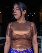 The Caramel Shimmer Baby Tee is your new go-to top when you want to shine without saying a word. This ultra-flattering cropped tee features a soft metallic shimmer that catches the light just right—perfect for golden hour selfies or glowing under stage lights. Whether you’re layering it or letting it steal the spotlight, this top brings the heat.