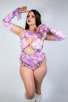 Own the rave in the Duckies Keyhole Bodysuit with Ruffles – bold cutouts meet playful ruffles in a striking purple, yellow, and pink color print built for the dancefloor.