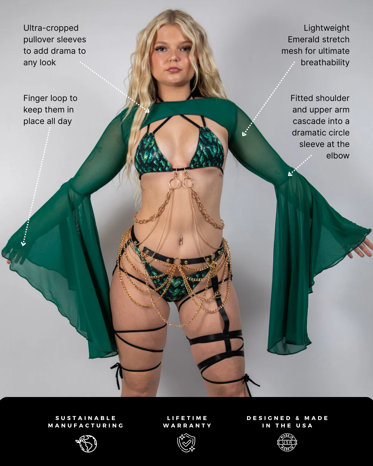 Unleash your inner goddess with our Emerald Mesh Bell Sleeves, designed to captivate under the lights of any rave. This enchanting green masterpiece features a sleek, ultra-cropped fit with structured shoulders that flow into dramatic, cascading circle sleeves. Lightweight and ethereal, every movement becomes a statement as the fabric sways effortlessly with the rhythm of the night.