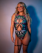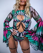 Get ready to shimmer and shine with the Flutter Keyhole Bodysuit—your new rave essential. This mesmerizing piece features a stunning pink and teal holographic finish that shifts and sparkles with every beat, paired with an enchanting butterfly design that'll have everyone's eyes on you. The keyhole cutouts add just the right amount of flirty edge, while the sleek bodysuit silhouette keeps you comfortable all night long. Whether you're dancing under the lights or vibing with your crew, this bodysuit is your ticket to turning heads and feeling absolutely magical.