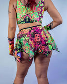 Introducing the Vivid Fairy Skirt, a must-have for raves! This wrap tie handkerchief-style skirt is perfect for a carefree fairy moment. The fairy skirt is double layered with a mesh top layer to give it some added dimension. Size down for a bit of added exposure when tying or true to size to tie the skirt end to end.