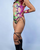 Get ready to glow at your next rave with our Intensity Keyhole Bodysuit! The UV reactive print will make you stand out in the crowd and add a fun touch to your outfit. Plus, the leg straps add a cute and unique detail.