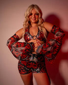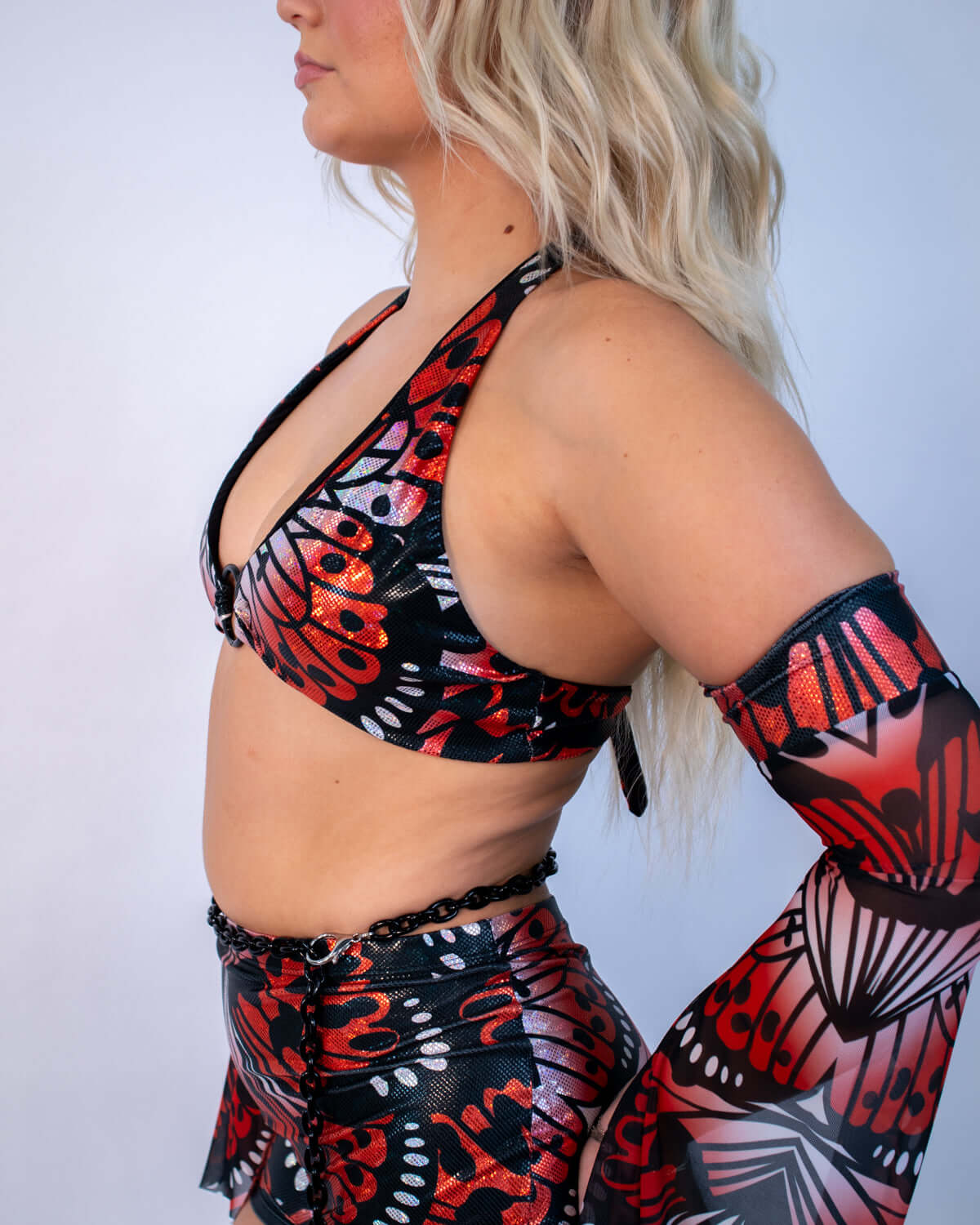 The Lacewing O-Ring Top is a seductive twist on a classic rave halter. With its eye-catching iridescent shimmer and daring O-ring centerpiece, this top brings the heat whether you're on the dancefloor or deep in the underworld of a warehouse set. The striking Lacewing print blends butterfly wings with fiery Halloween vibes—think enchanted forest meets midnight mischief.