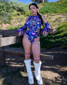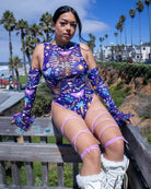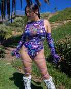 The Lucent Slit Sideboob Bodysuit is where celestial meets seductive. This high-neck one-piece features intricate side cutouts and front slits for an edgy, skin-baring look, made even more magical with our limited-edition Lucent print—an enchanted nighttime scene filled with glowing mushrooms, moths, and other forest-inspired elements.