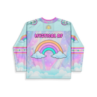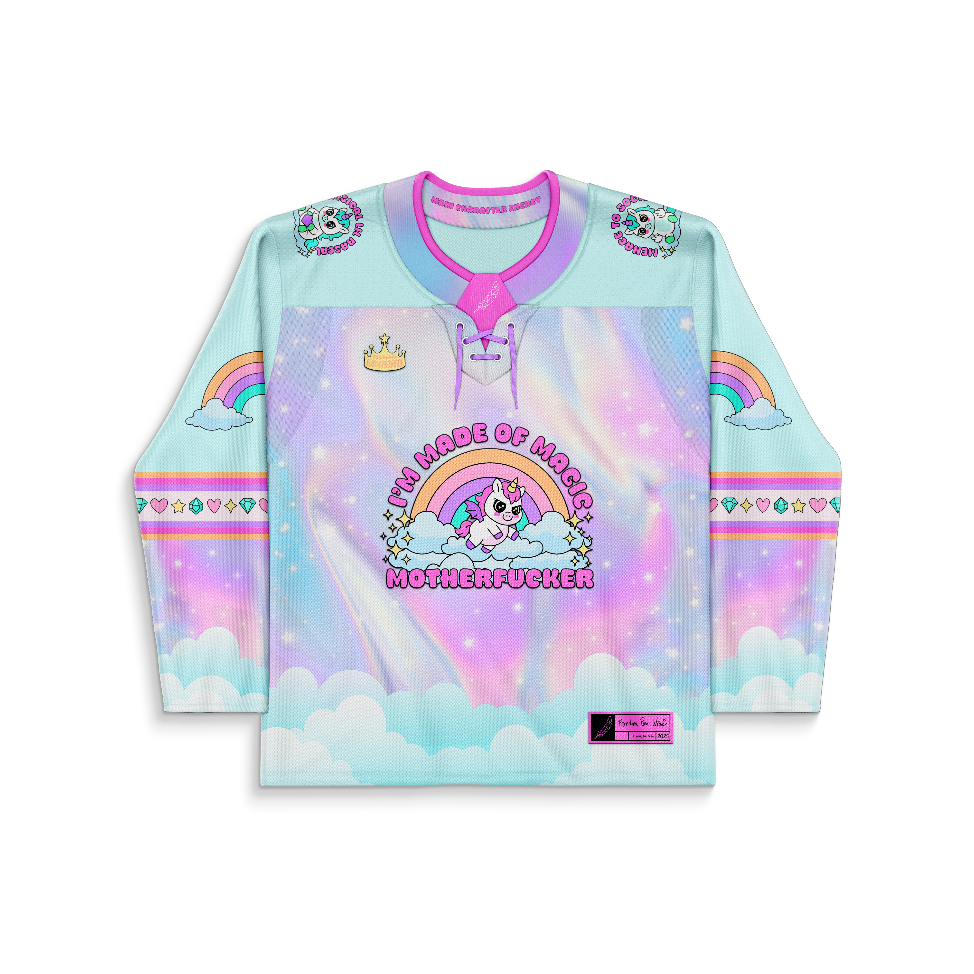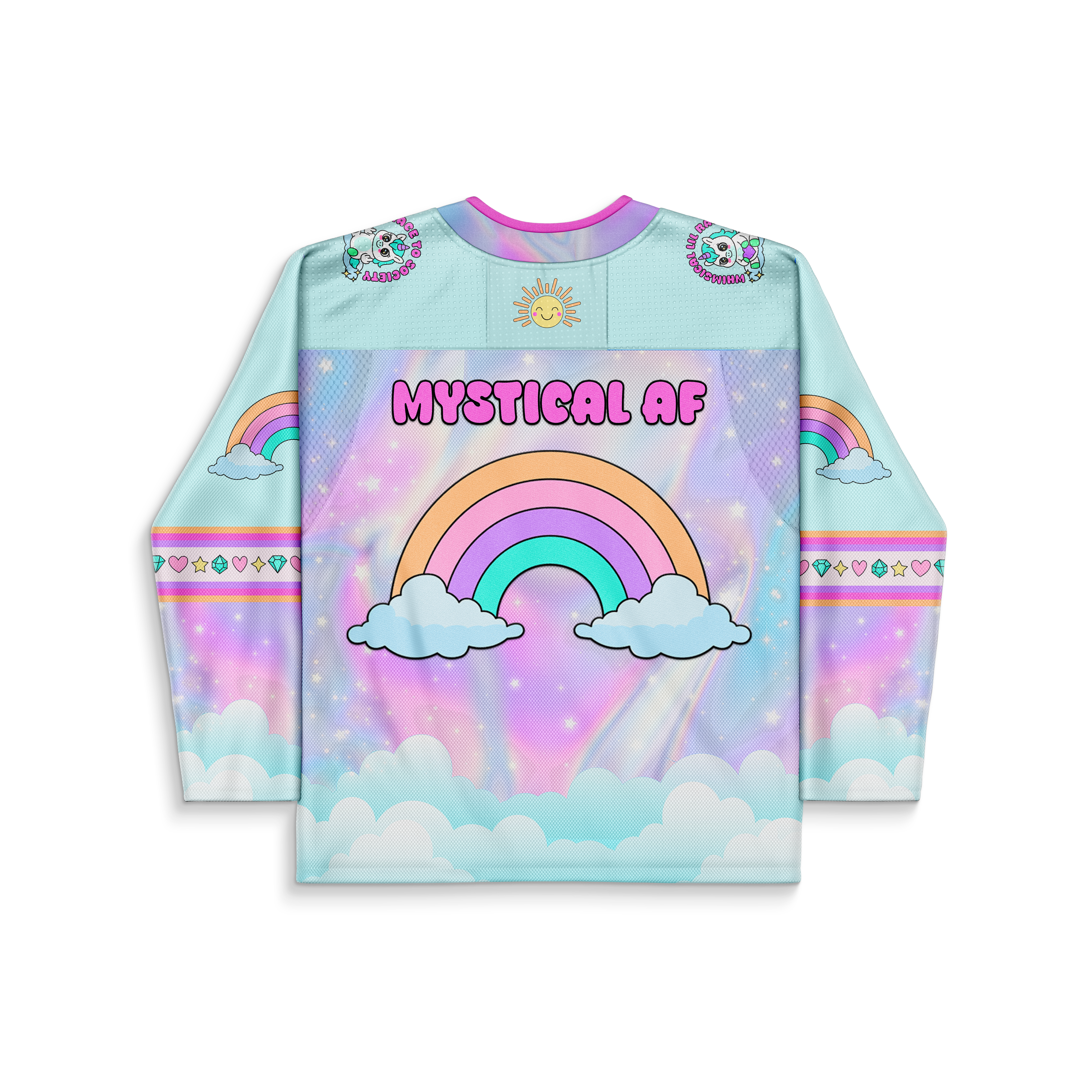 Introducing Mystical AF, the jersey for anyone who radiates chaotic sparkle energy everywhere they go. This pastel fever dream features a sassy unicorn blasting across a rainbow like it owns the entire multiverse — because honestly, it does. Clouds, crowns, gems, and cosmic shimmer wrap you in the kind of magic that turns every dance floor into your personal enchanted realm.