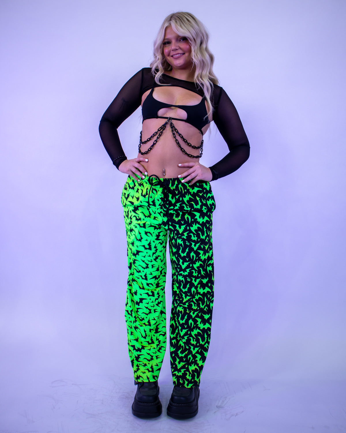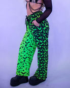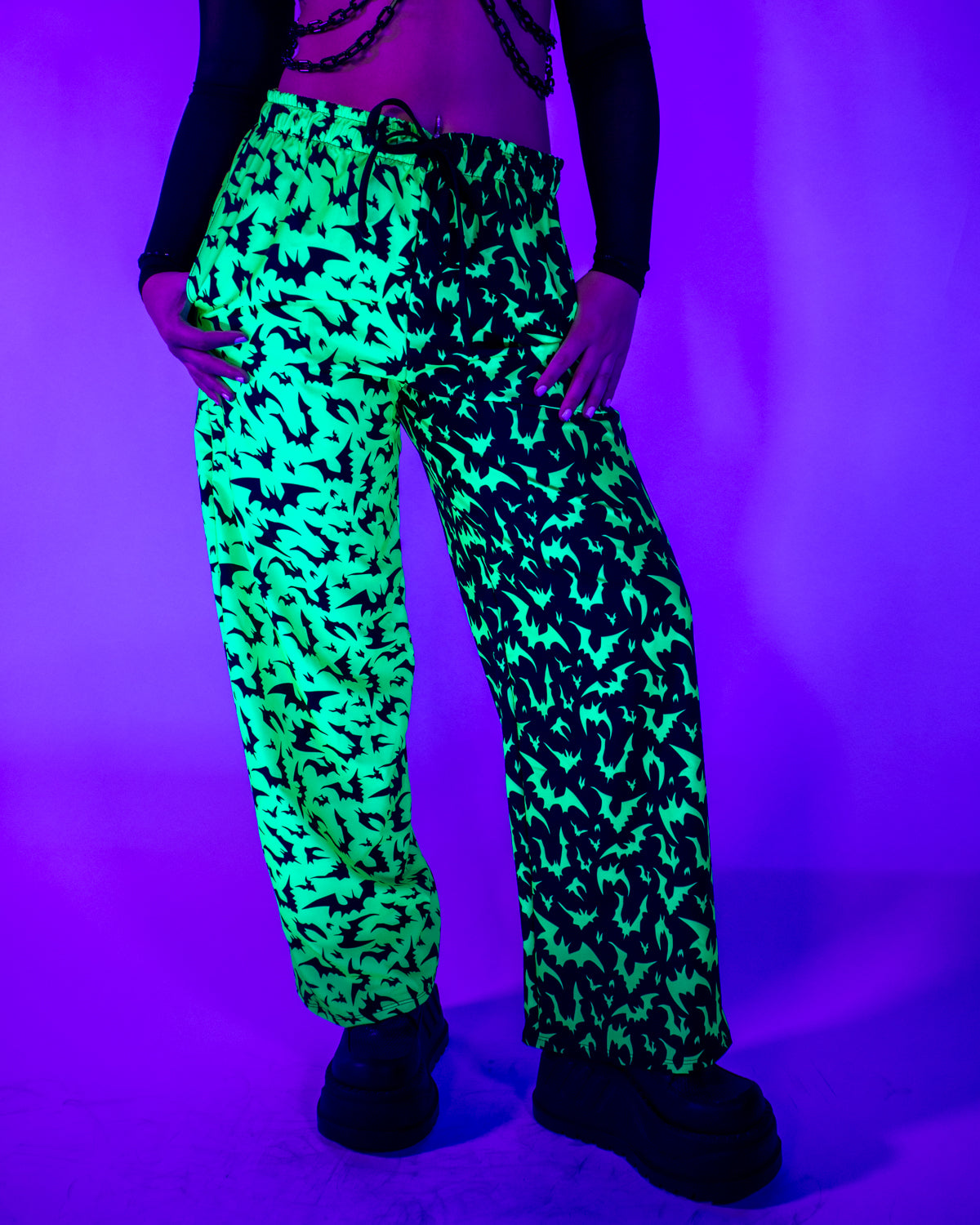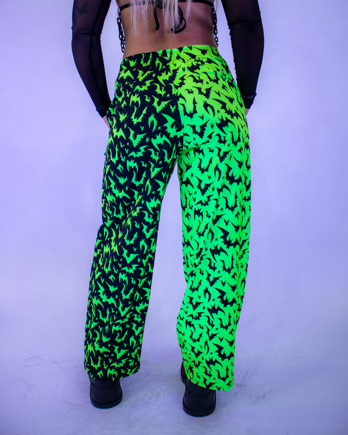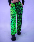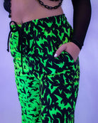 The Batty 50/50 Lucy Pants in UV Green are a split-tone statement piece that brings the chaos—in the best way. With one leg in neon lime and the other in classic black, both swarmed with electric bat silhouettes, this design glows like wildfire under blacklight. These aren’t your average rave pants—they’re your new Halloween ride-or-die.