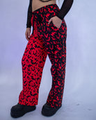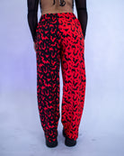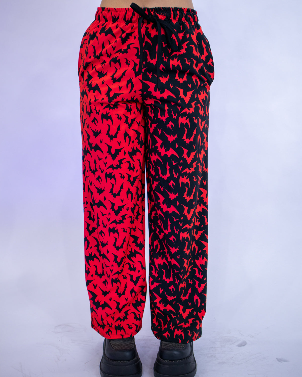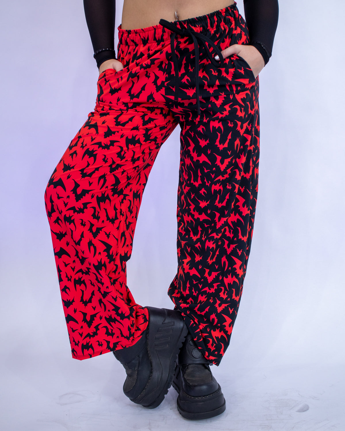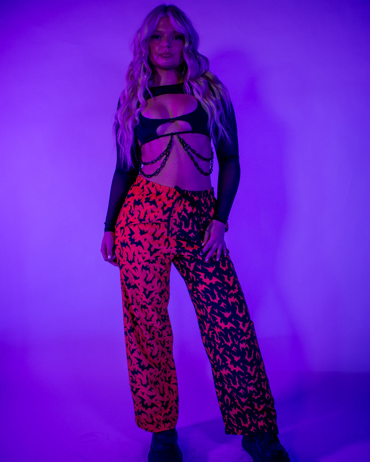 The Batty 50/50 Lucy Pants UV Red are all about split-personality perfection. One leg red, one leg black, both drenched in a chaotic swirl of UV-reactive bats that glow under blacklight. These pants are an instant standout, built for spooky season takeovers and all-night movement on the dancefloor.