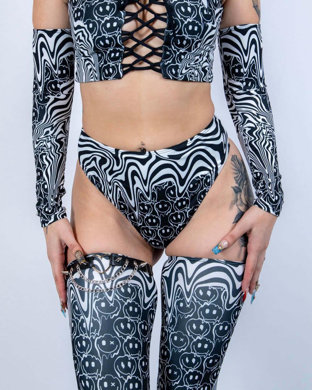 Wrap your waist in style and comfort with our Meltdown High Waisted Thong! Featuring a trippy melty smiley face fabric, this thong provides the perfect blend of sexy and comfort. Embrace your inner fire and add a touch of fun to your rave collection with this must-have piece!