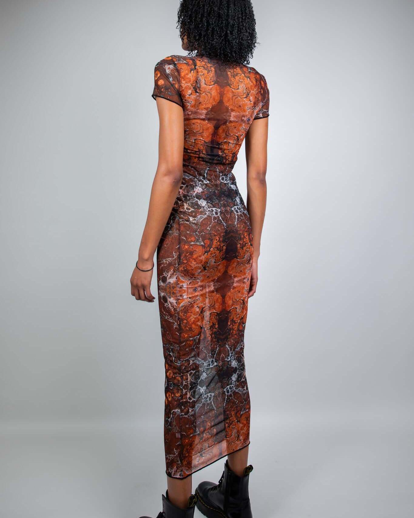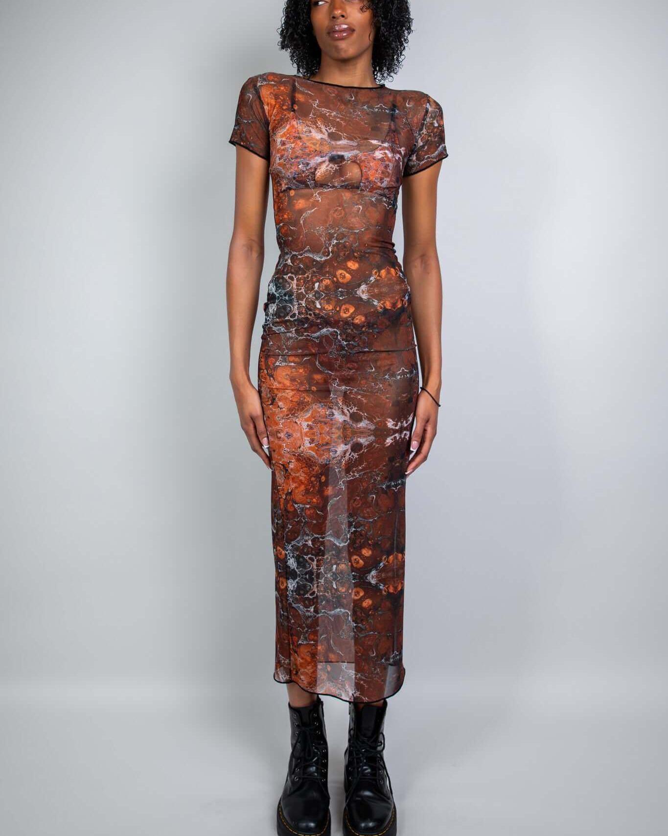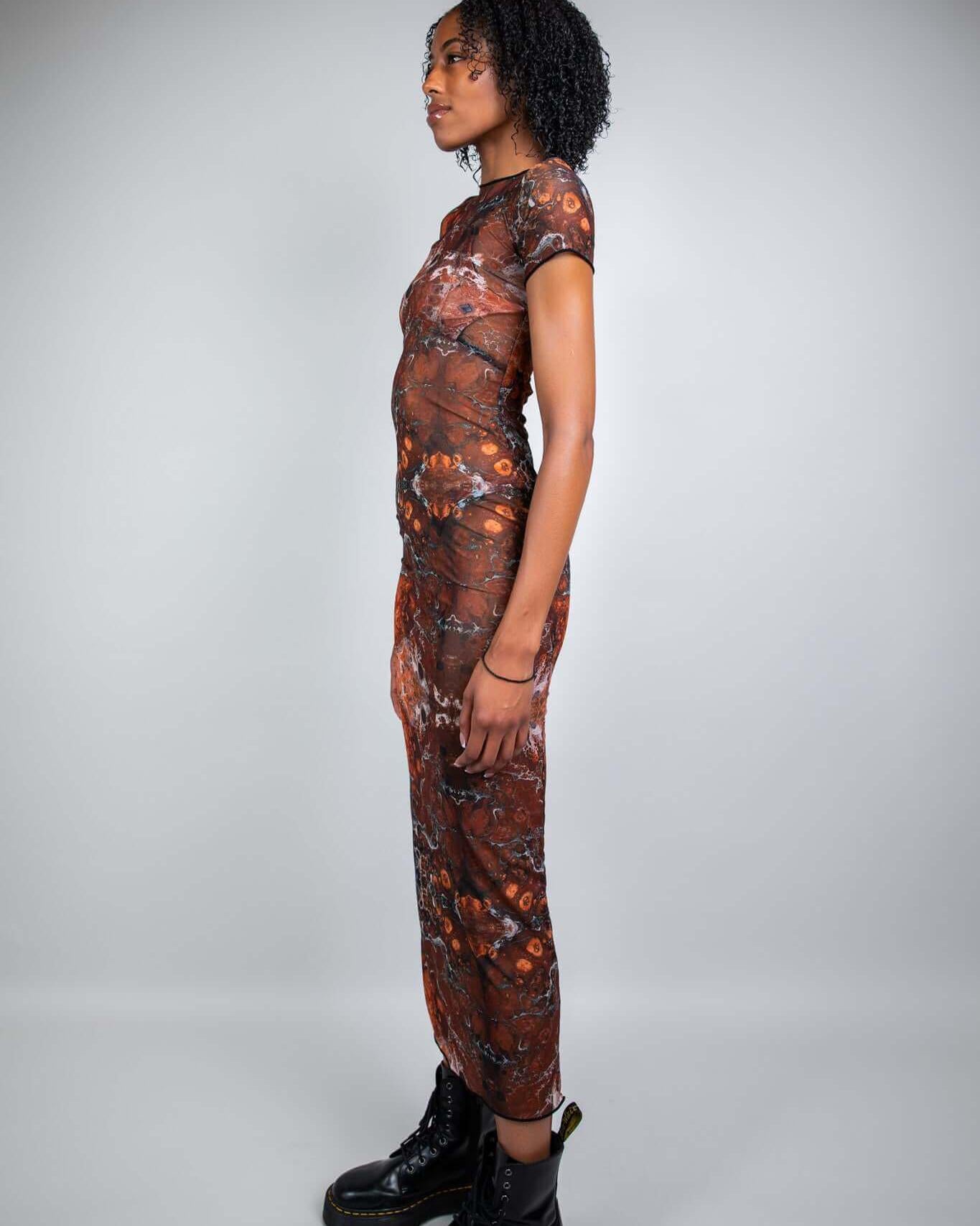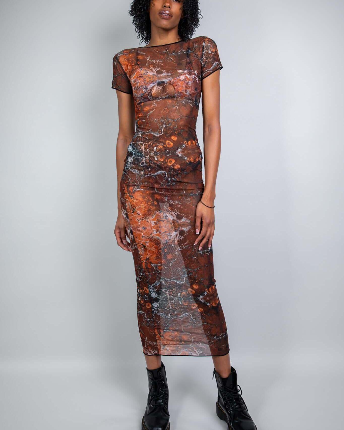 A fusion of our cropped tee and a maxi skirt, the Mesh Baby Tee Maxi Dress creates a subtle, yet sexy, silhouette. Featuring the same high neckline, cap sleeves, and merrow hem as the Baby Tee, this fitted, floor-length dress provides an effortless slay for any rave or nightclub. The breathable mesh fabric offers a glimpse at what is layered underneath.