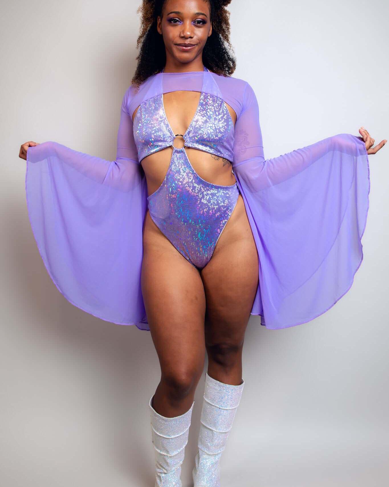These ultra-cropped pullover sleeves will add a etheral vibe to any rave look. A fitted shoulder and upper arm cascade into a dramatic circle sleeve at the elbow that flows along with arm movements. Secured in place with a finger loop, our lightweight mesh bell sleeves pair perfectly with your favorite top or bodysuit.