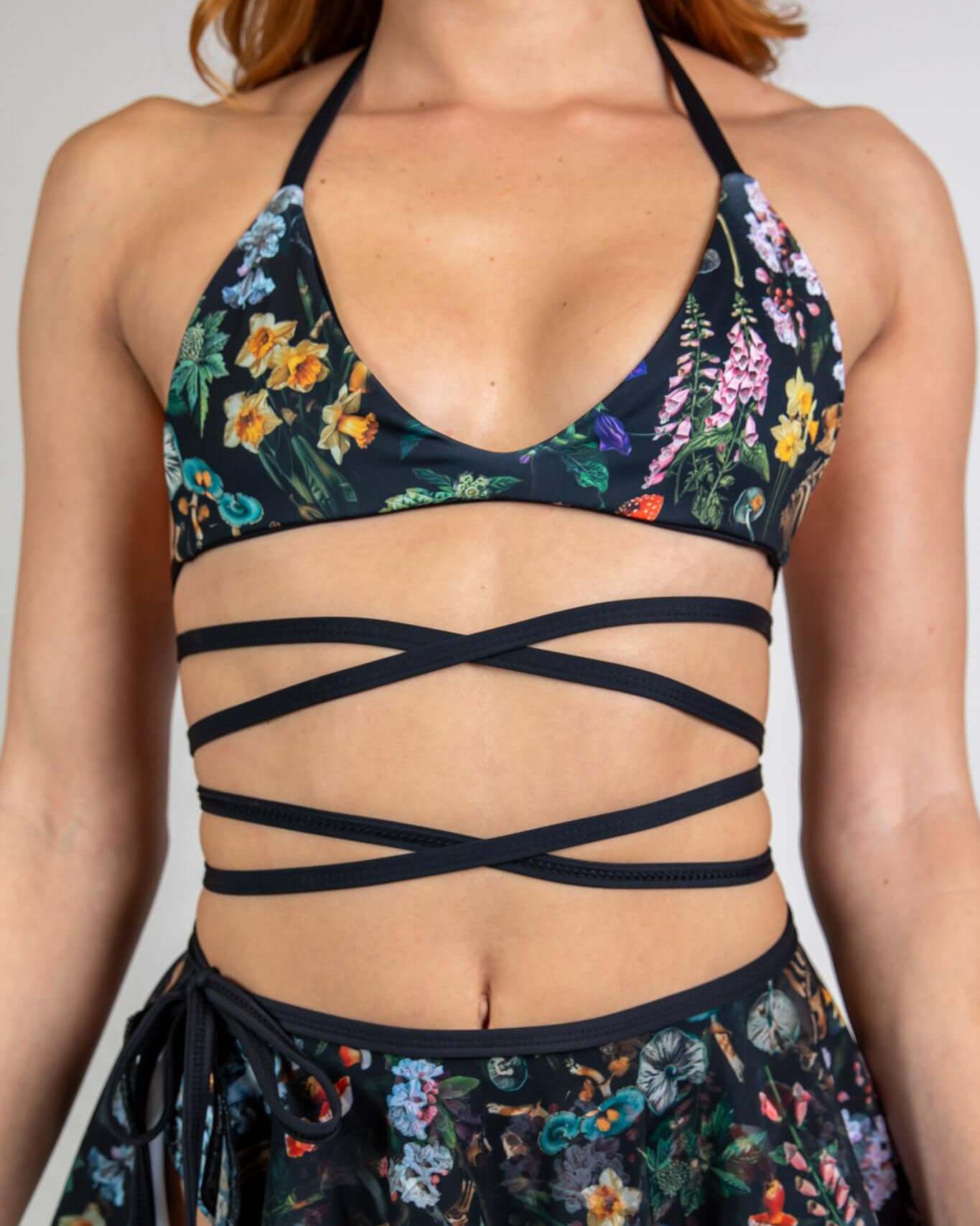 The Poison Extra Mile Bralette combines edgy style with versatile comfort. Featuring a bold print of skulls, mushrooms, and poisonous plants, this halter bralette has adjustable wraparound straps that give it a unique, flattering fit. Perfect for festivals, layering, or as a statement top for any occasion.