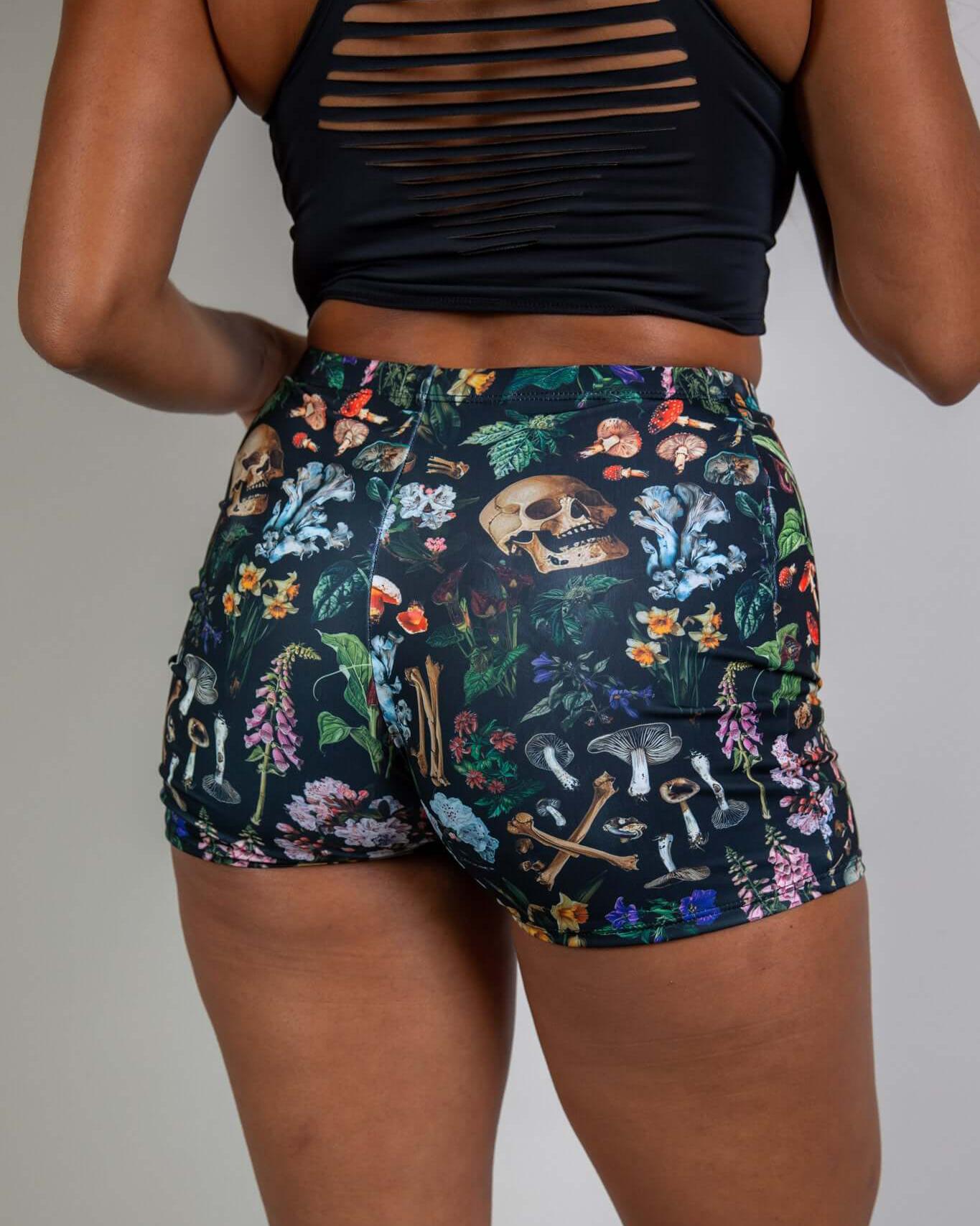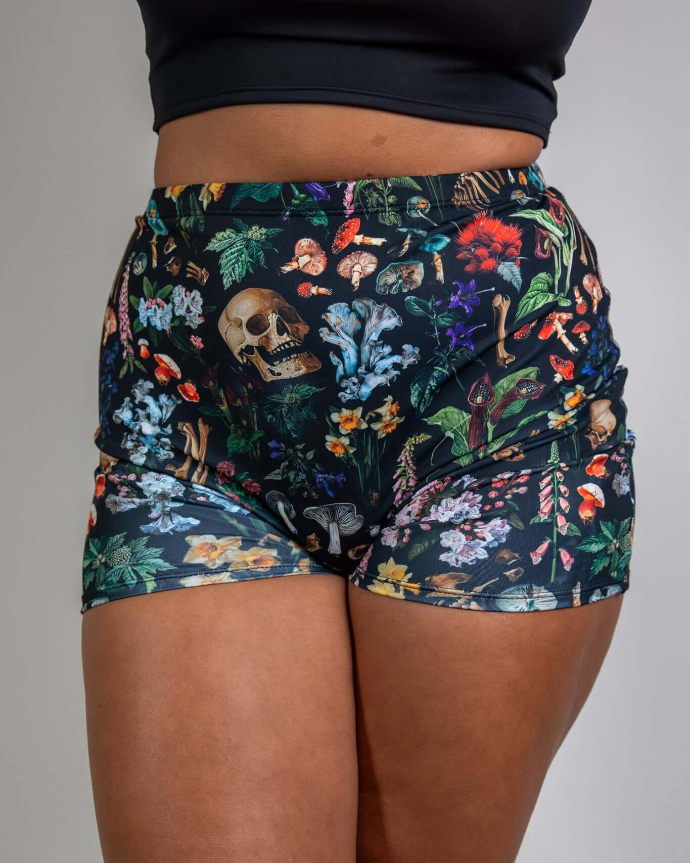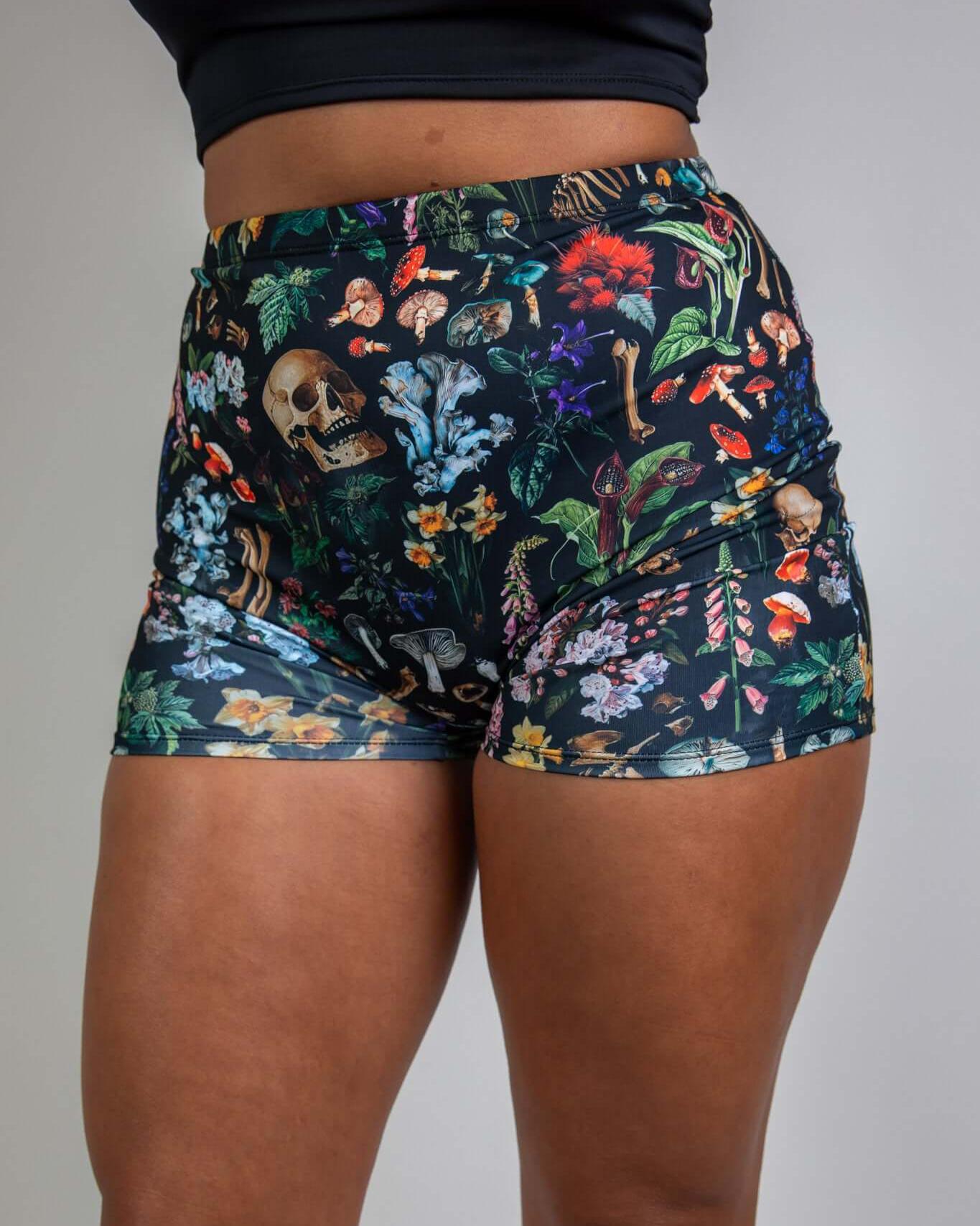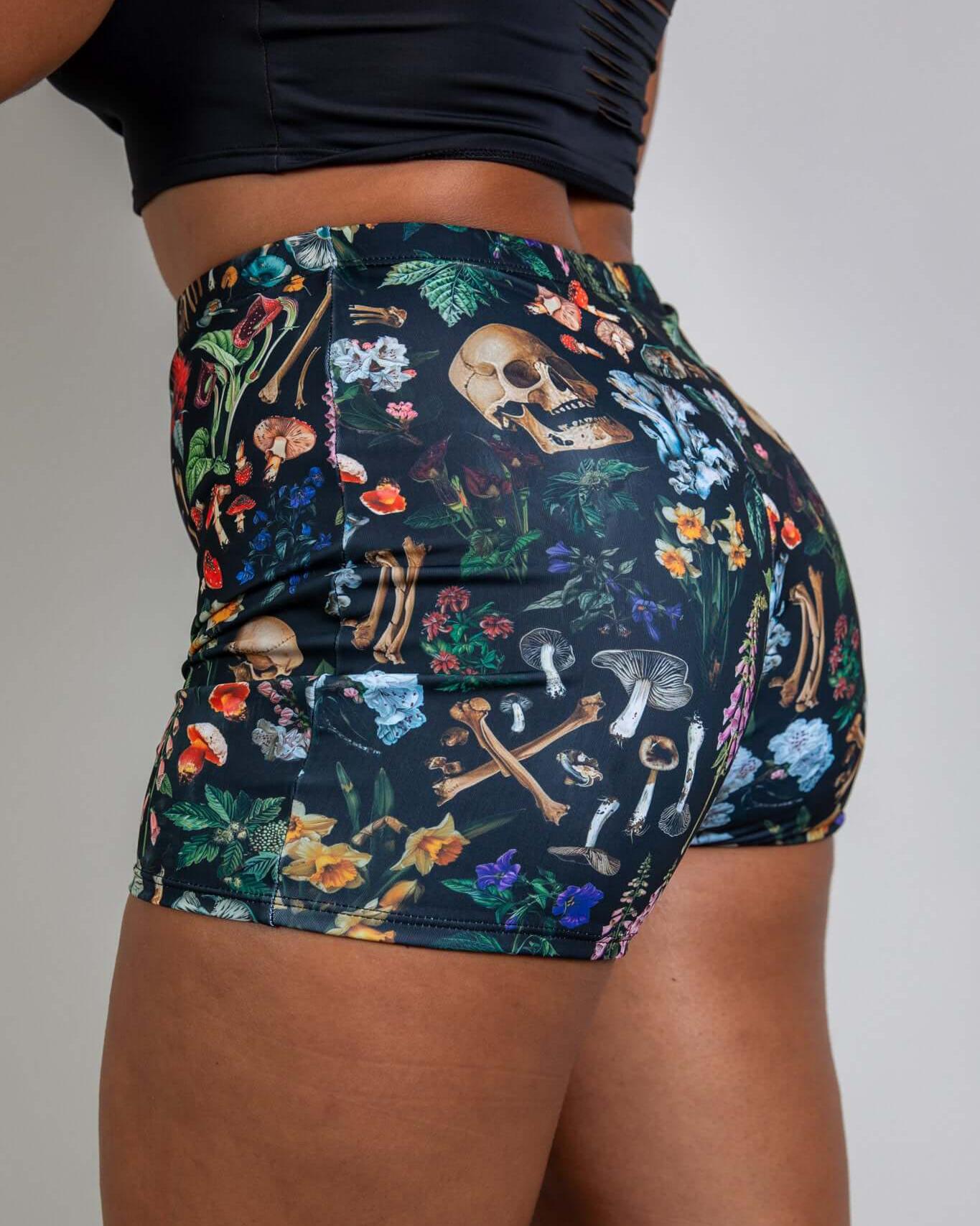 Poison High Waist Shorts featuring a bold print of skulls, mushrooms, and poisonous plants, These shorts hug your curves with a flattering, comfortable fit. Designed for style and versatility.