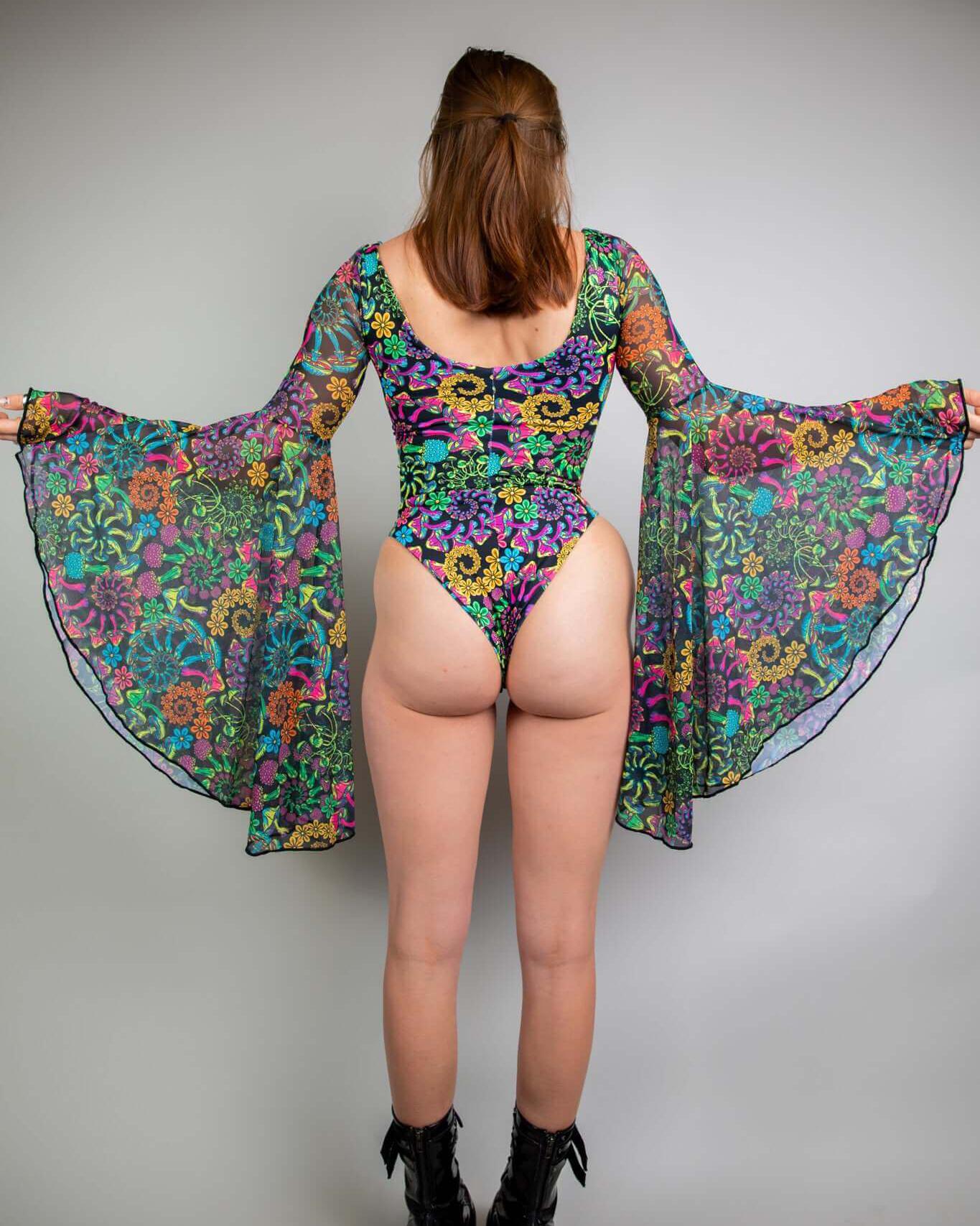 Get ready to rave in style with the PsyBloom Goddess Bodysuit! With lace up detailing at the chest, the Goddess Bodysuit is double-lined for added comfort and security. This mid-hip cut, thong back bodysuit also features full mesh sleeves fitted at the shoulder and upper arm that cascade into a dramatic circle sleeve at the elbow. A finger loop secures the sleeves to the hand so they flow along with arm movements.