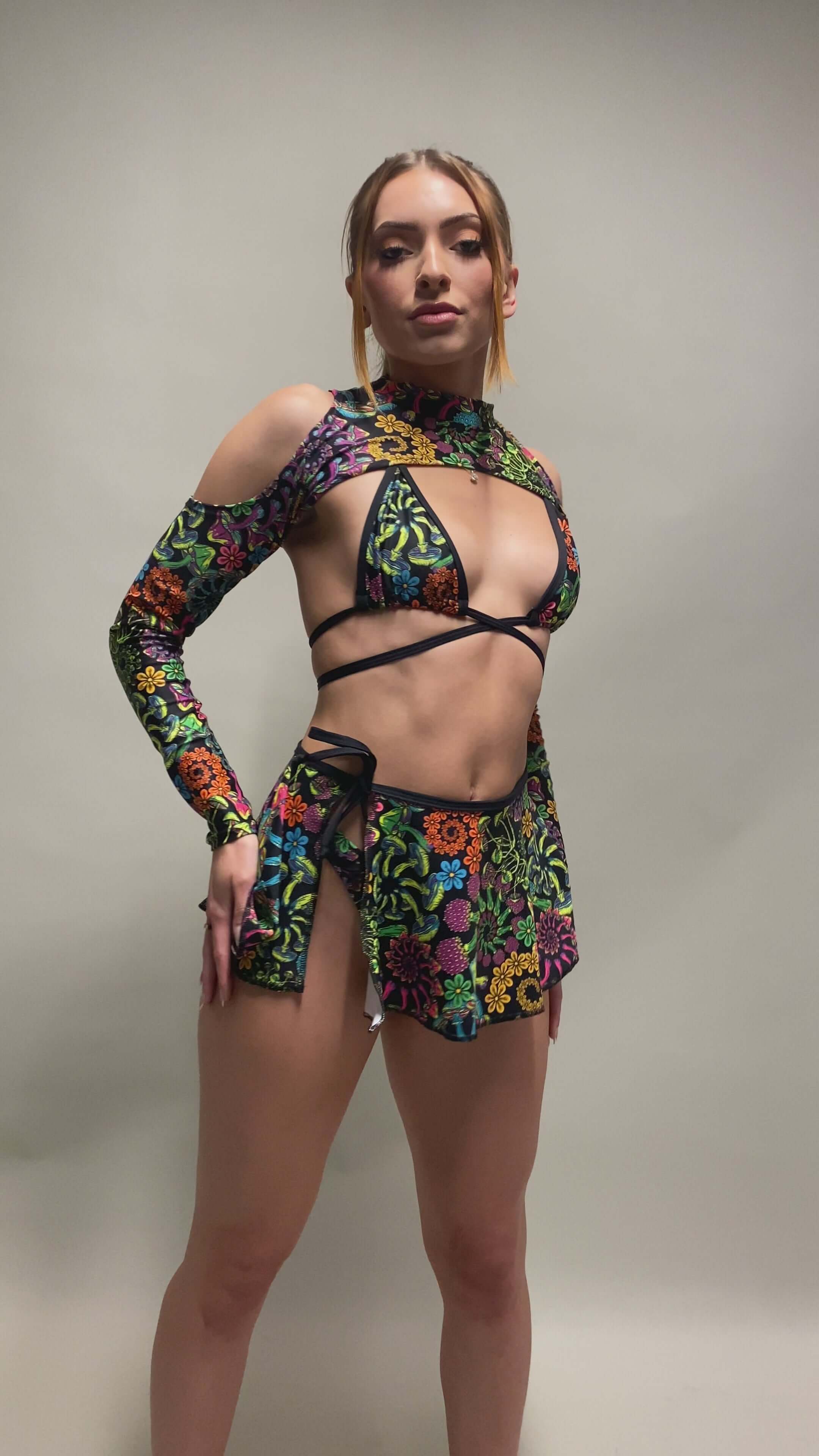 Get ready to turn heads and embrace your wild side with our PsyBloom Wrap Bikini Top! This trippy mushroom print top is perfect for raves and adding a touch of quirkiness to your swimwear collection. With its wrap design, you can customize the fit to your liking. Bring your inner psychedelic vibes to the beach or pool with this playful and unique bikini top.