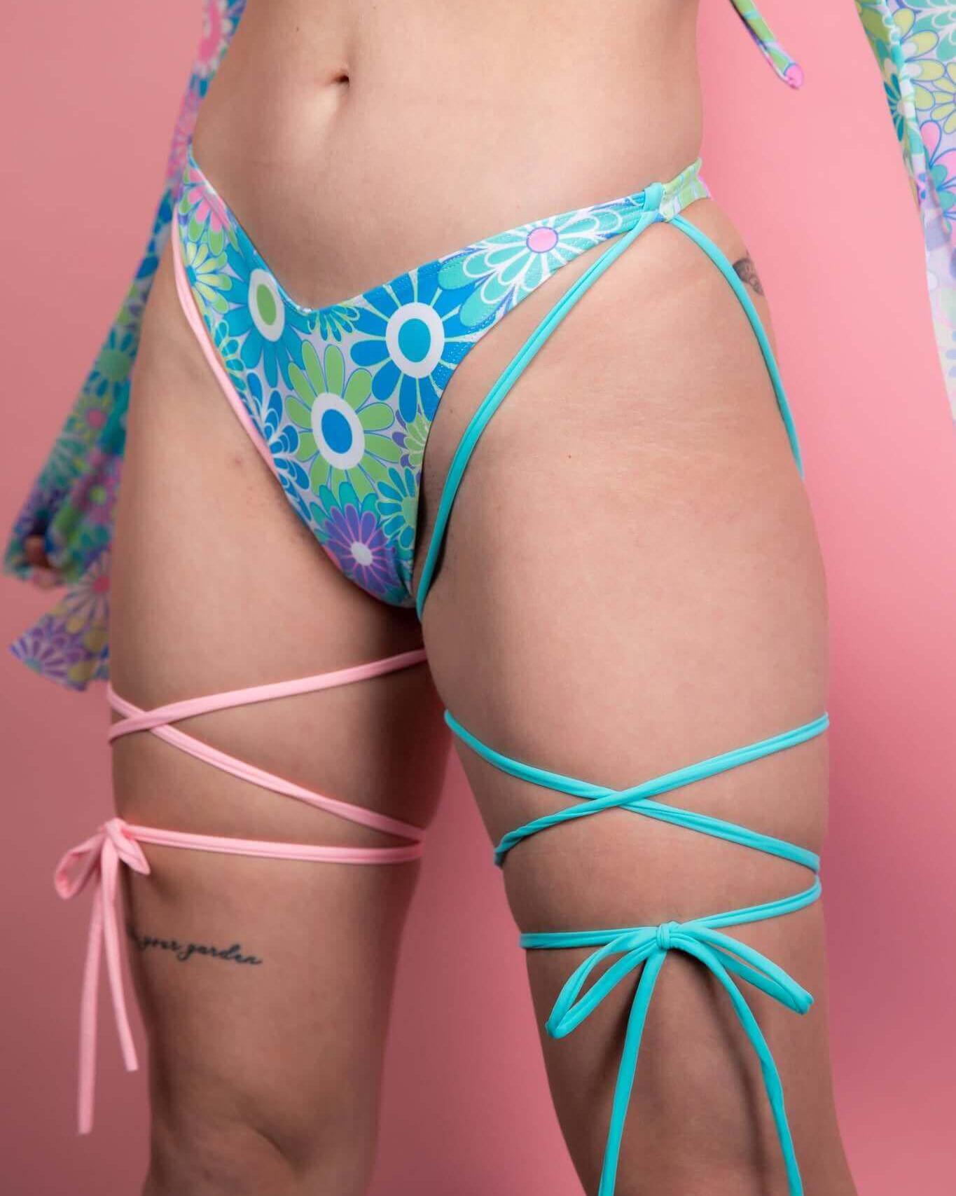 Introducing our Retro Bloom strappy bikini bottoms, exclusively designed by FRW. The vibrant floral print, inspired by Daisy Lane, is made on recycled material, making it both stylish and eco-friendly! But that's not all - the bikini is also blacklight reactive, perfect for standing out at your next festival or party. The colorful straps add an extra touch of style and flair to this already eye-catching bikini!