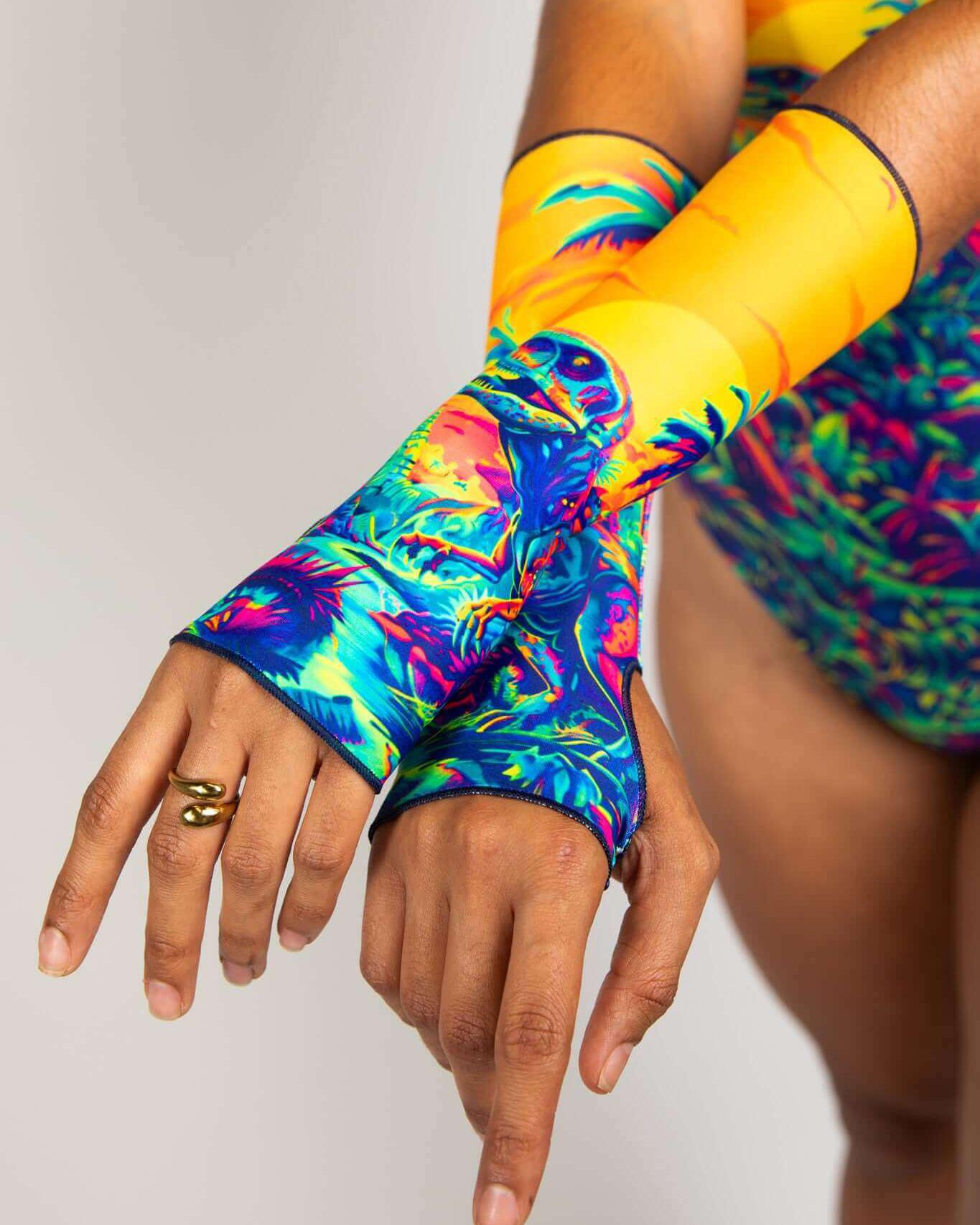 Unleash your wild side with our Saurian Gloves. Featuring a sunset colored dinosaur scene, these gloves are sure to add a fun and sexy touch to any outfit. A shorter version of our Arm Sleeves! These gloves feature and over the wrist design with thumb holes. The top of the gloves sit comfortably on the forearm just below the elbow.