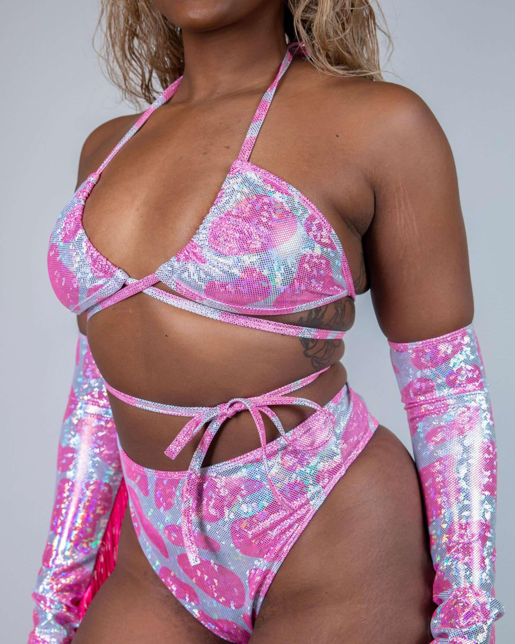 Add some playful pizzazz to your beach or rave look with our Strawberry Milkshake Wrap Bikini Top! Featuring a unique pink cow print design with a touch of sparkle, this wrap top will make you stand out in the best way possible. Get ready to mooove and groove!