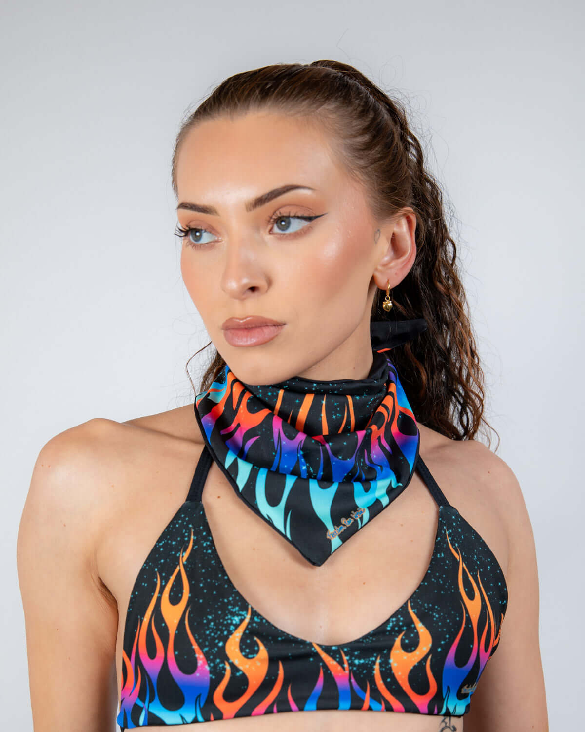 Small piece. Big heat. The Blaze Bandana brings extra fire to any festival look. Made with our signature cosmic flame print, this versatile accessory turns up the vibe whether you wear it as a face cover, neck scarf, or hair piece. It’s the final touch that pulls the whole inferno together.