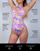 Maximum impact meets fearless style at every rave in the Duckies Slit Sideboob Bodysuit with Leg Straps – bold cutouts, strappy details, and a vibrant purple, yellow, and pink color print built to turn heads.