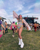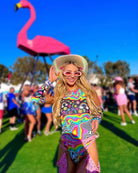 Stand out at your next EDM festival with our best-selling Sideboob Bodysuit. This psychedelic rainbow bodysuit is full of color and symbols that are perfect for your next rave! Available in Plus Sizes and made sustainably with recycled material
