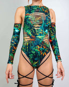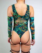 Get wild in our Mesozoic Slit Sideboob Bodysuit. This rave-ready bodysuit features a playful dinosaur jungle print that's sure to turn heads. With its daring sideboob cutouts, it's the perfect outfit for a fun and flirty night out. Go ahead, unleash your inner jungle queen!