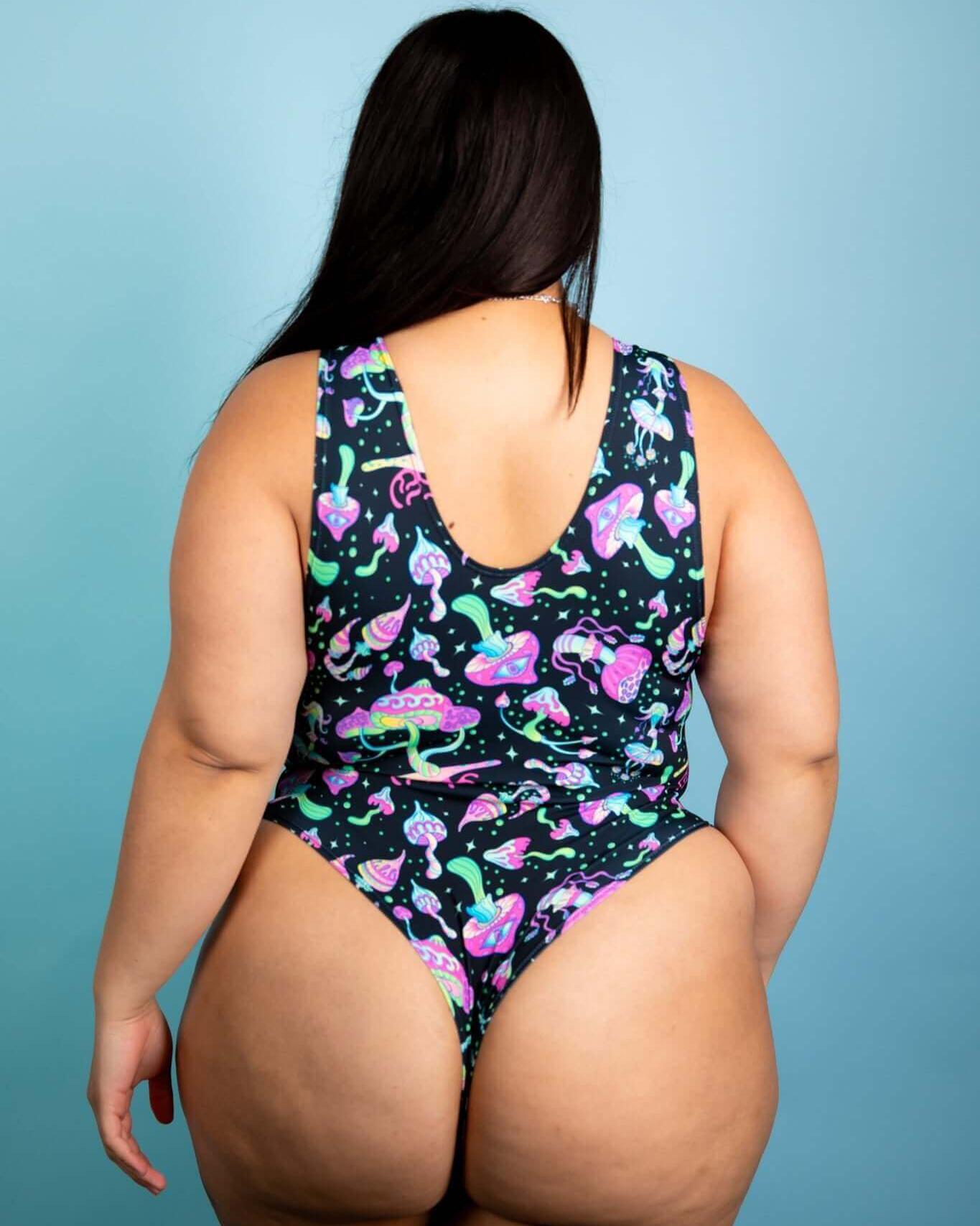 Stand out in the crowd at your next EDM festival with our best-selling sideboob bodysuit. This psychedelic mushroom design is perfect for your next rave! Available in plus sizes and made sustainably with recycled material so you can look good and feel good about what you wear