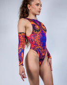 This ultra-high-cut one-piece features striking sideboob exposure and a sleek open-back silhouette, balanced by a high neckline for a chic, futuristic feel. Made with eco-luxe stretch fabric, it moves with you as you dance, sparkle, and slay.