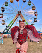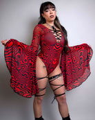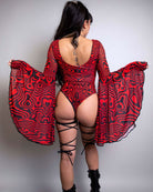 Get ready to show off your cosmic side in our Red Void Goddess Bodysuit! With lace up detailing at the chest, the Goddess Bodysuit is double-lined for added comfort and security. This mid-hip cut, thong back bodysuit also features full mesh sleeves fitted at the shoulder and upper arm that cascade into a dramatic circle sleeve at the elbow. A finger loop secures the sleeves to the hand so they flow along with arm movements.