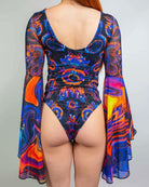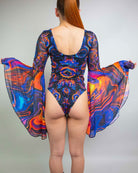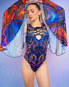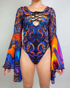 Become a rave goddess in our ShadowFlame bodysuit! With lace up detailing at the chest, the Goddess Bodysuit is double-lined for added comfort and security. This mid-hip cut, thong back bodysuit also features full mesh sleeves fitted at the shoulder and upper arm that cascade into a dramatic circle sleeve at the elbow. A finger loop secures the sleeves to the hand so they flow along with arm movements.