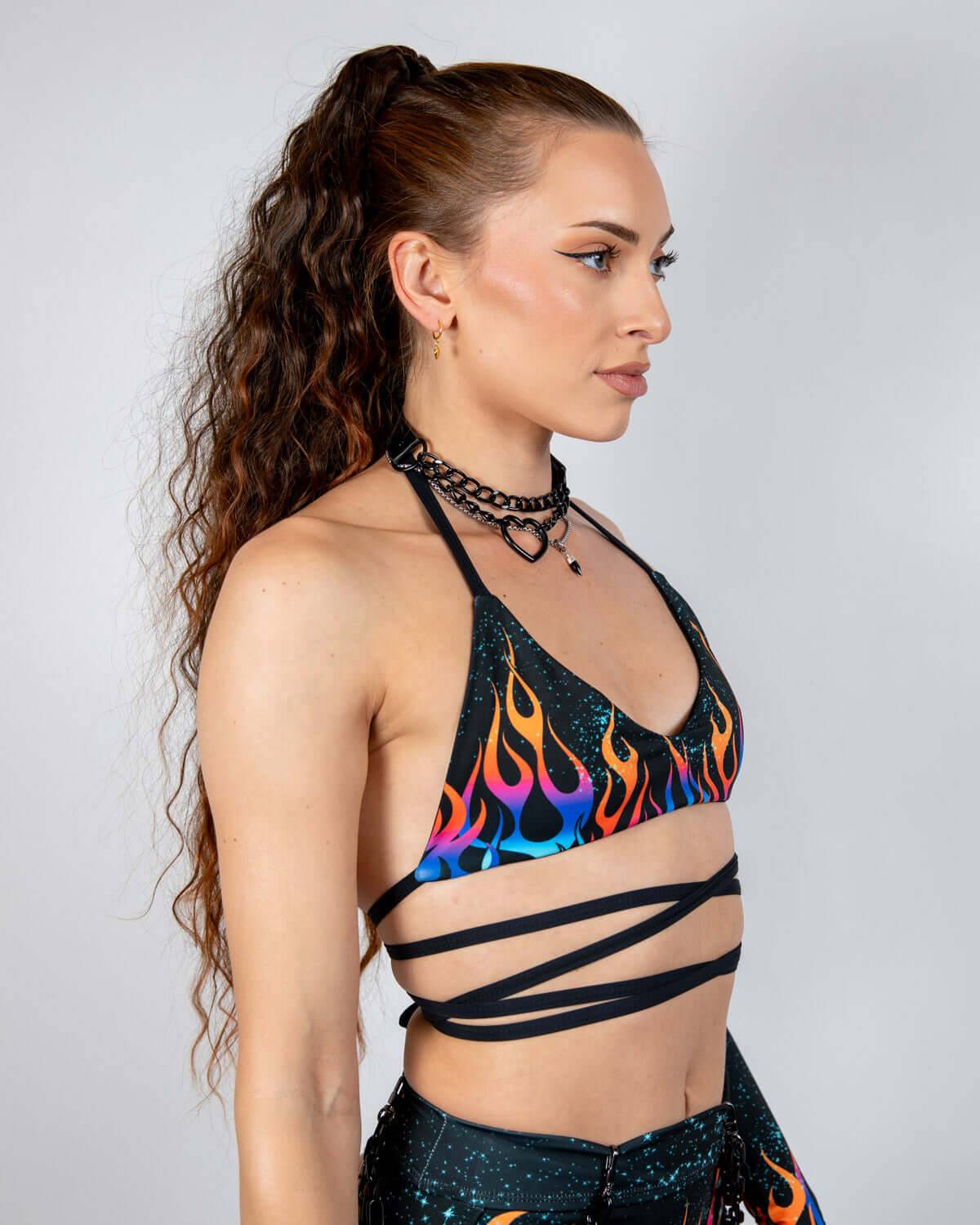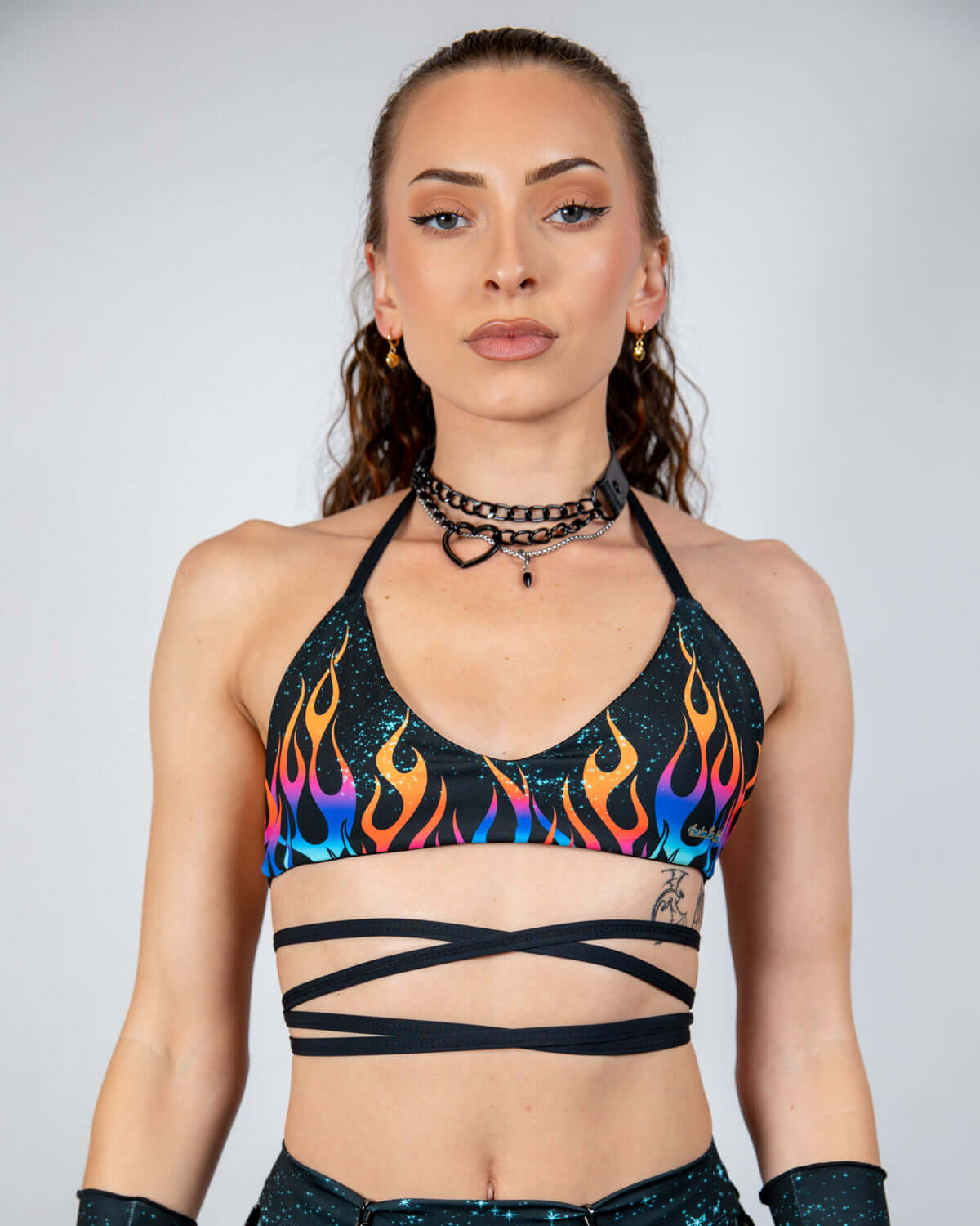 She doesn’t stop at hot—she goes the extra mile. The Blaze Extra Mile Bralette is your strappy, fire-fueled statement top for festivals, dancefloors, and center-stage slays. Featuring our signature star-speckled flame print, this piece turns up the heat with a flattering scoop front, wraparound body straps, and a vibe that’s always turned on.