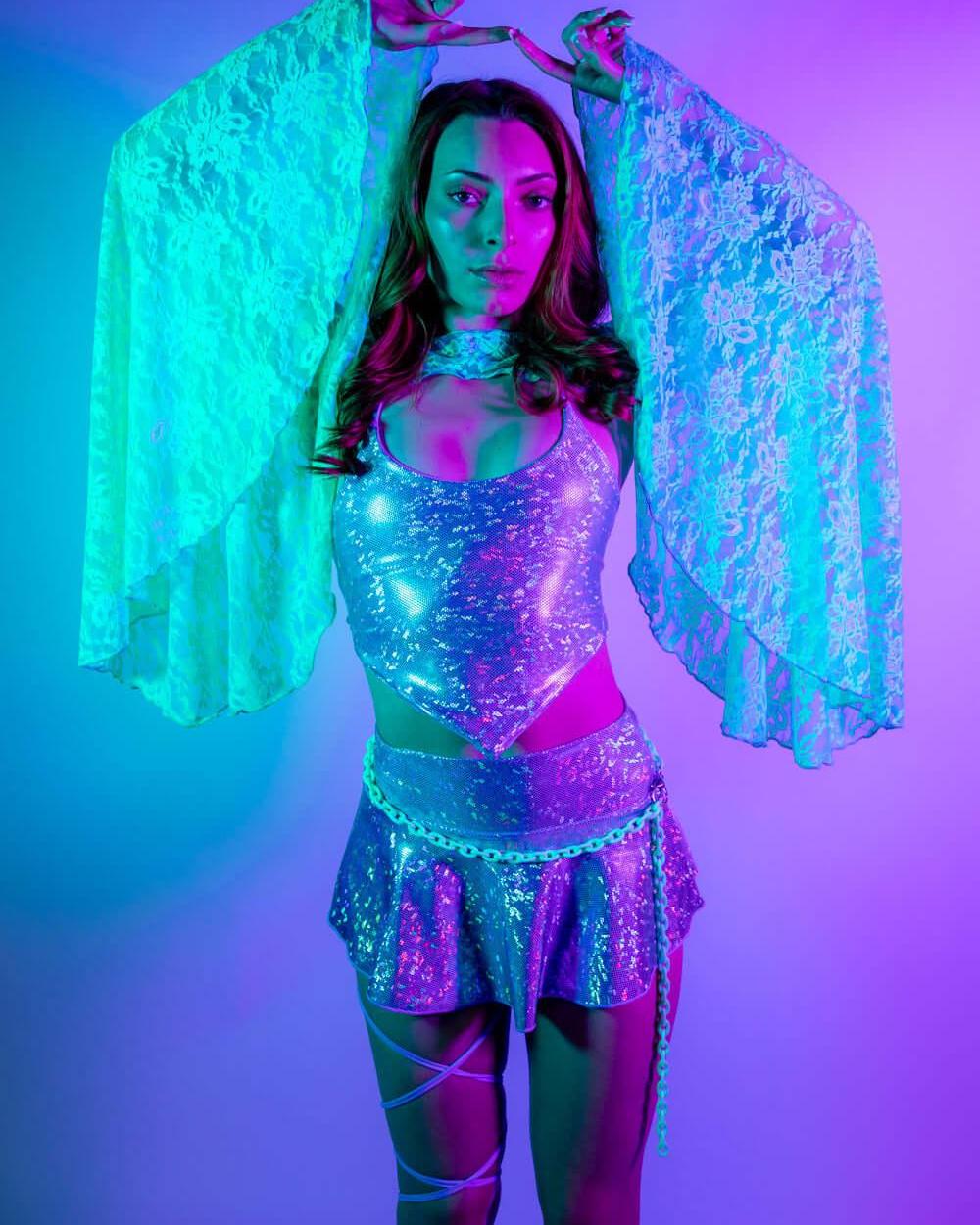 Dance into the festival world with our super-short pullover sleeves that bring magical vibes to your outfit! The snug fit at your shoulder and upper arm playfully transforms into a swirling circle sleeve below the elbow, making your dance moves even more mesmerizing. These featherlight mesh bell sleeves come with a handy finger loop and perfectly jazz up any top or bodysuit in your rave collection.