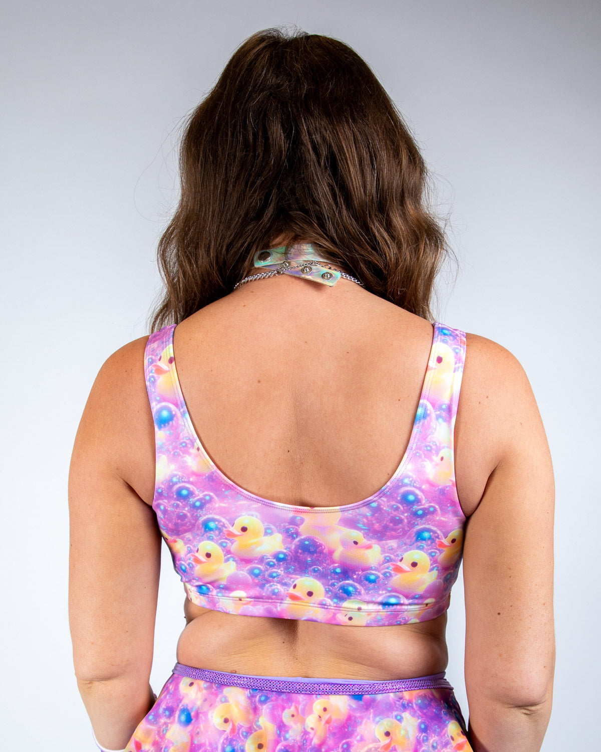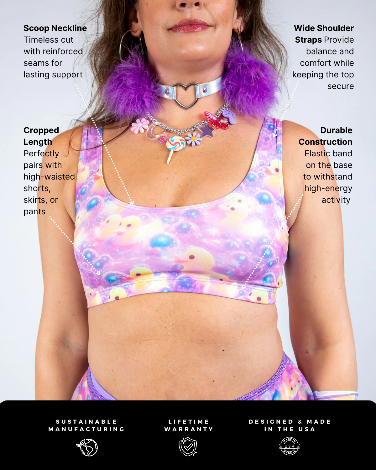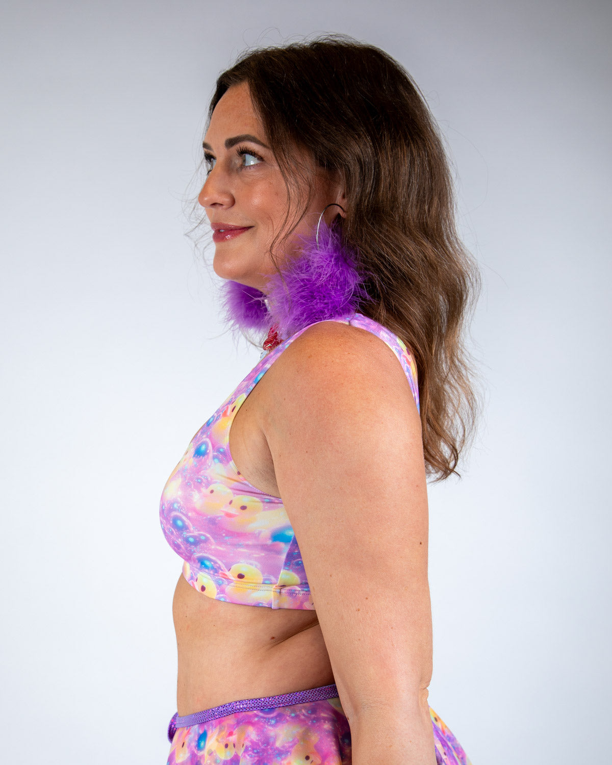 The foundation of every rave-ready wardrobe begins with the Duckies Classic Top – a festival essential that combines comfort, style, and bold energy. Featuring a vibrant purple, yellow, and pink color print, this cropped piece delivers maximum impact while keeping you moving freely from the first beat to the final encore.