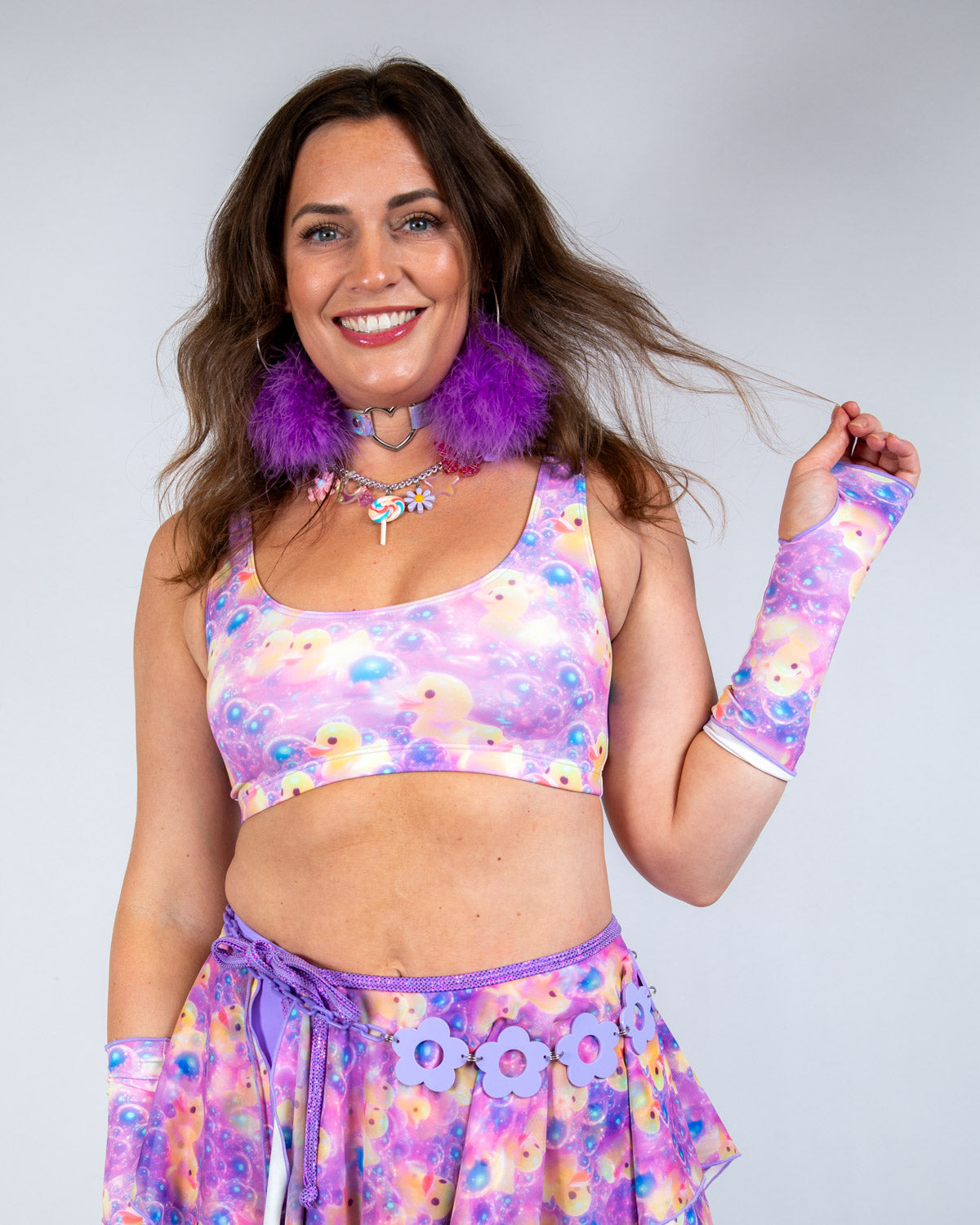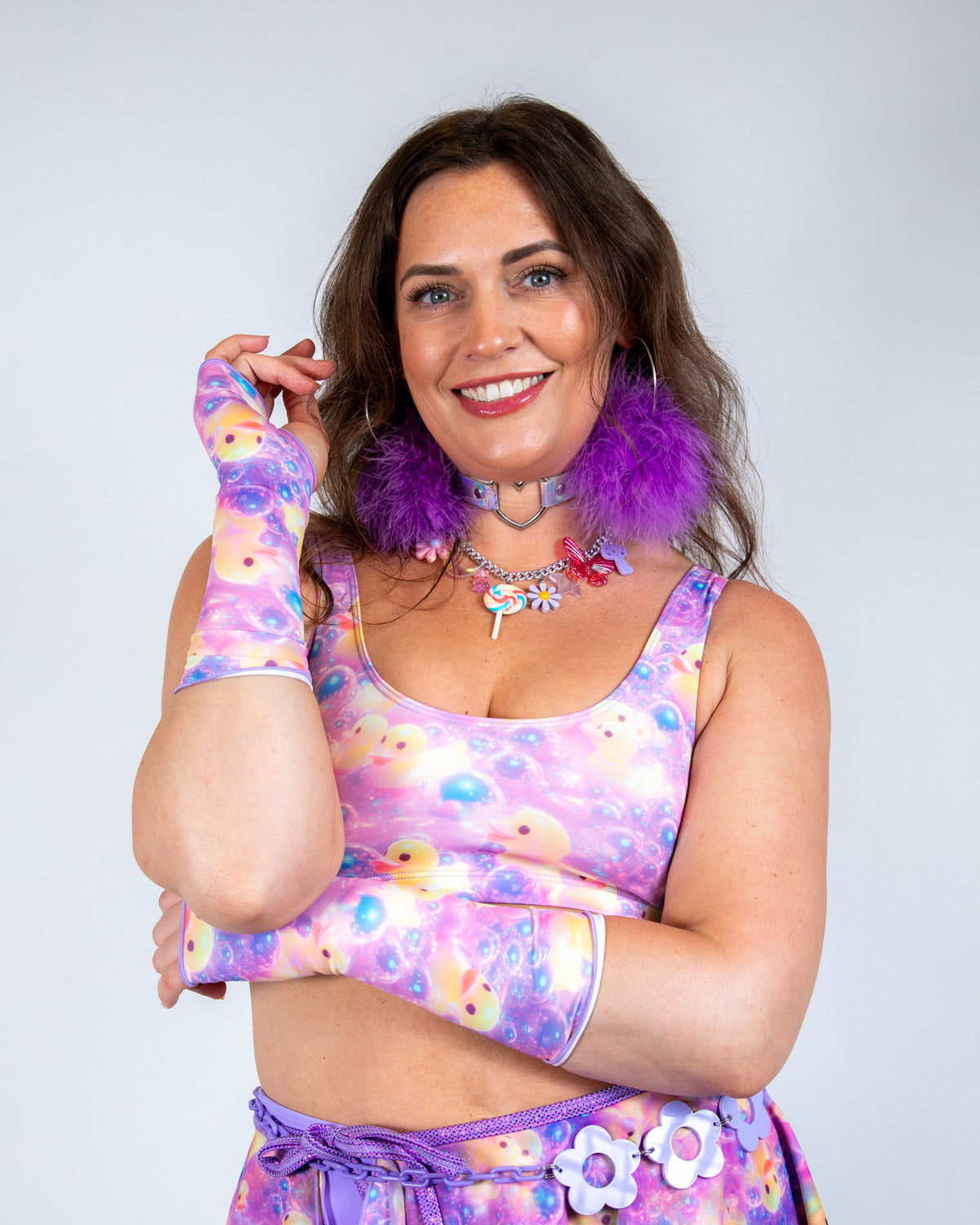 Complete your rave transformation with the Duckies Gloves – fingerless arm warmers that bring style, comfort, and festival energy to every beat. Featuring a bold purple, yellow, and pink color print on breathable mesh, these gloves are the ultimate rave accessory for day-to-night dancing.