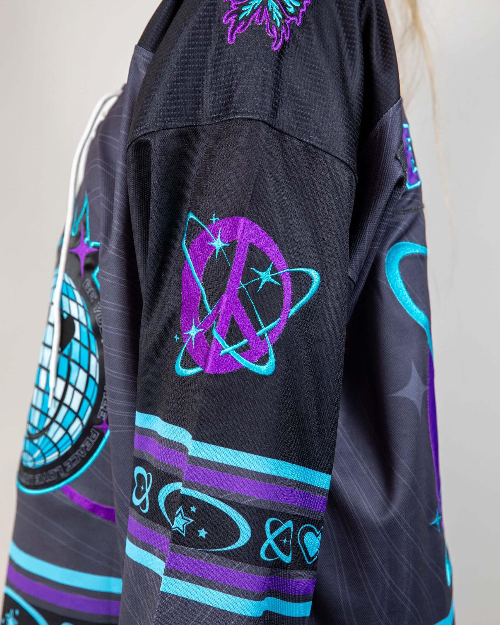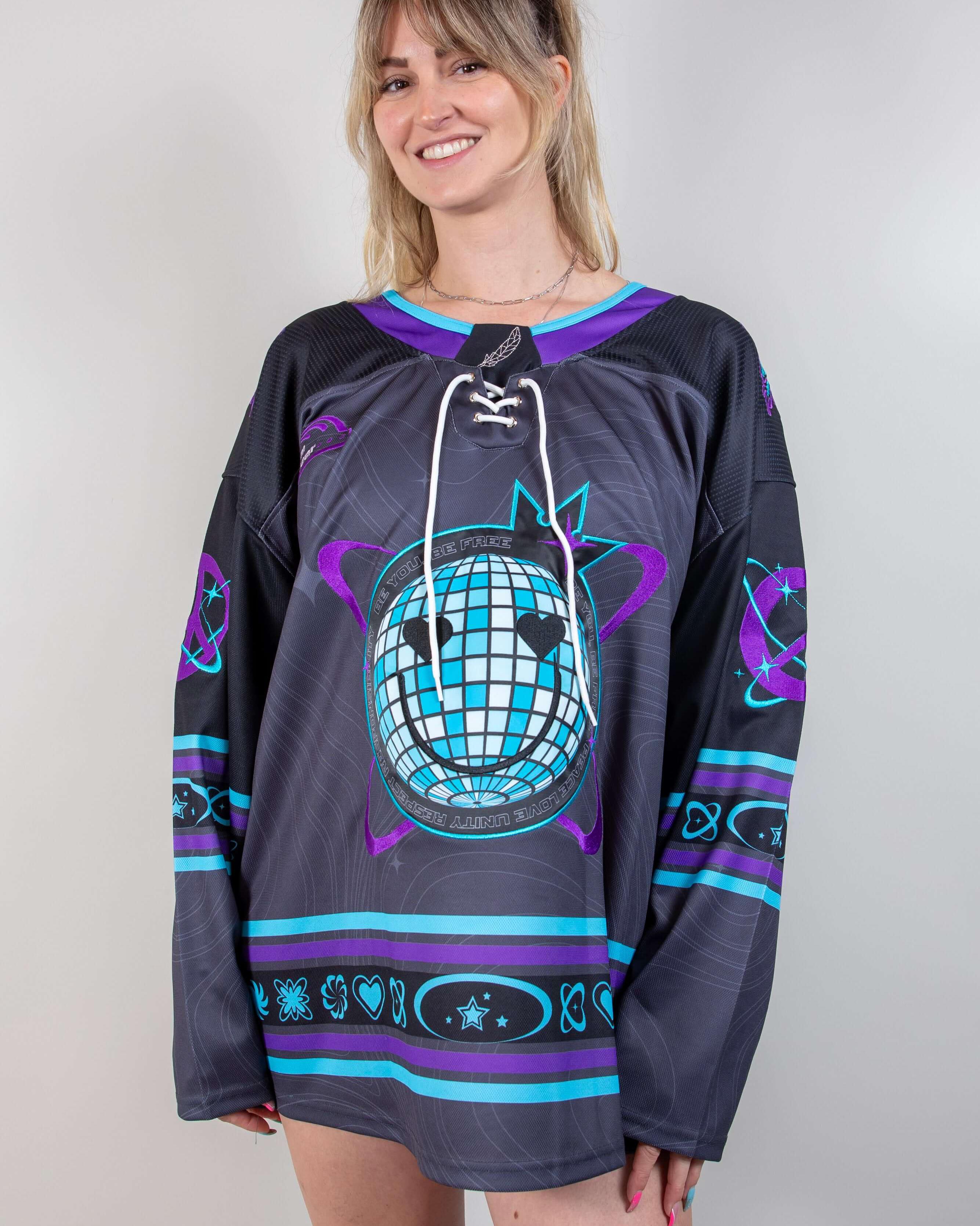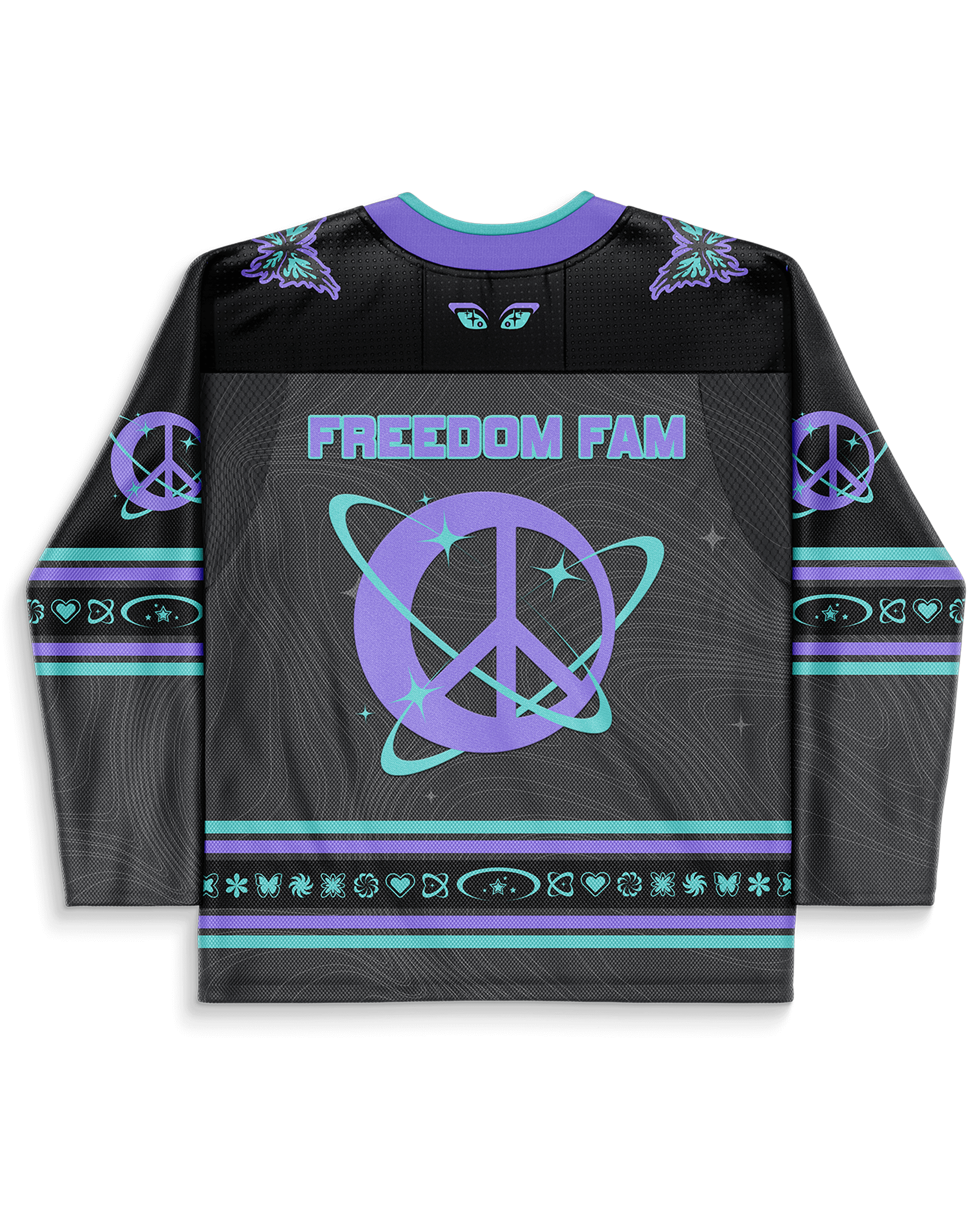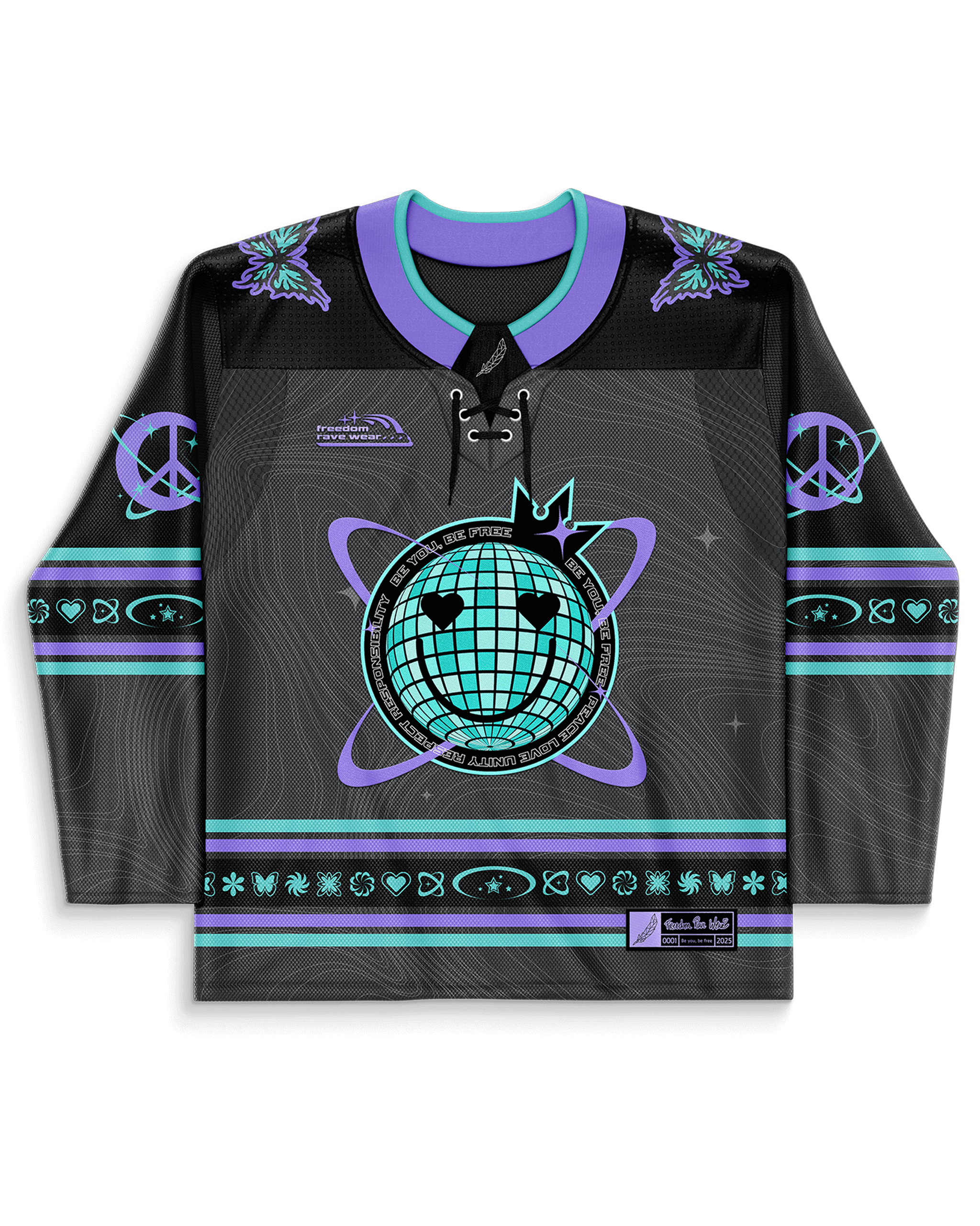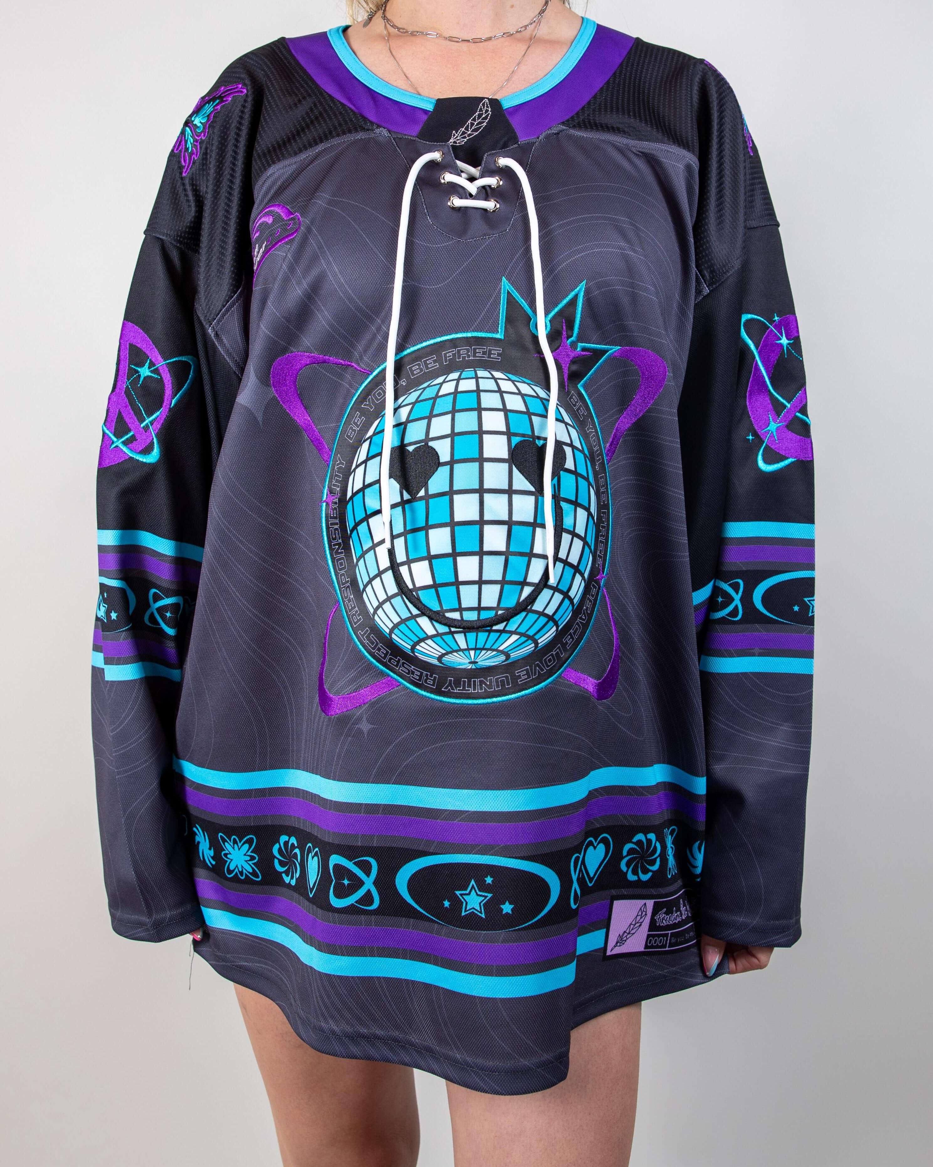 Expertly crafted for our Freedom Fam, our first ever LIMITED EDITION hockey jersey is designed with bold purples and blues that embody the essence of FRW. Lightweight and breathable material ensures optimal comfort at the rave, while the embroidered patches on the front, back, and sleeves elevate the jersey to a whole new level.
