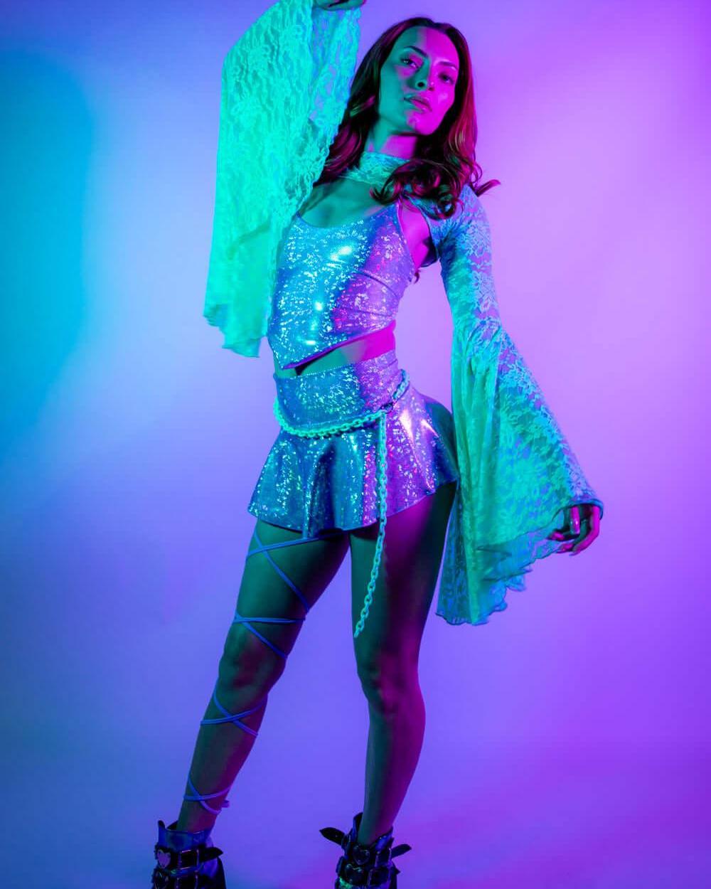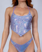 Flaunt your festival style in our Lavender Holo V Top! This eye-catching piece features a flattering V-shaped neckline and playful lace-up back detail that's perfect for showing off some skin. The shimmery holographic lavender fabric catches the light with every move, making you the center of attention on the dance floor. Ready to turn heads at your next rave!