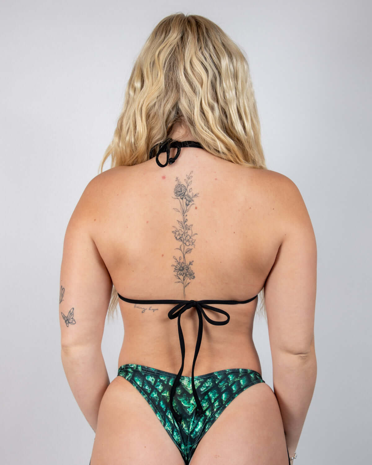 Let your wild side out. The Predator Strappy Bikini Top delivers fierce triangle vibes with an edge—perfect for those who slay from sunrise set to afterparty. Bold straps and shimmering scales turn every look into a full-power prowl.